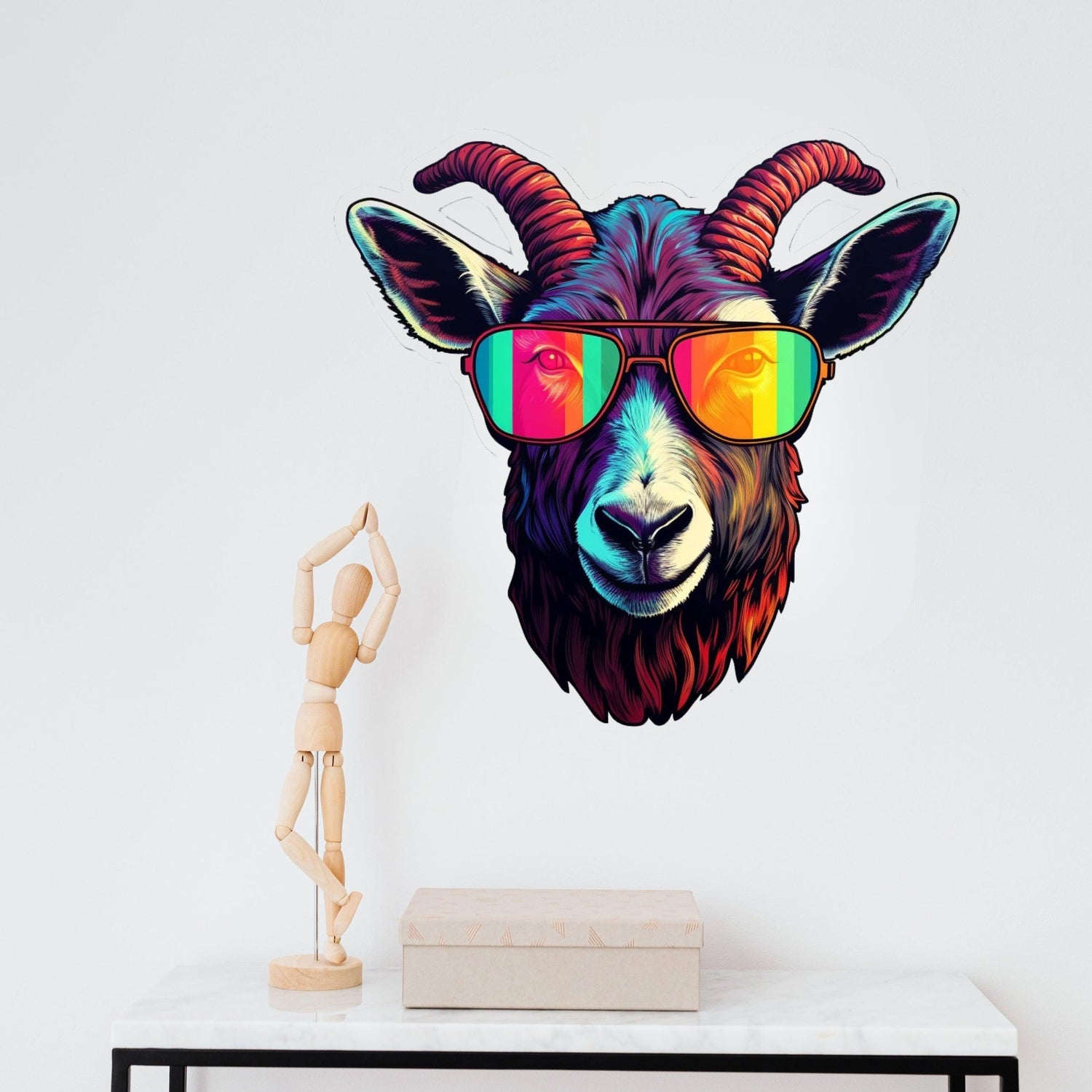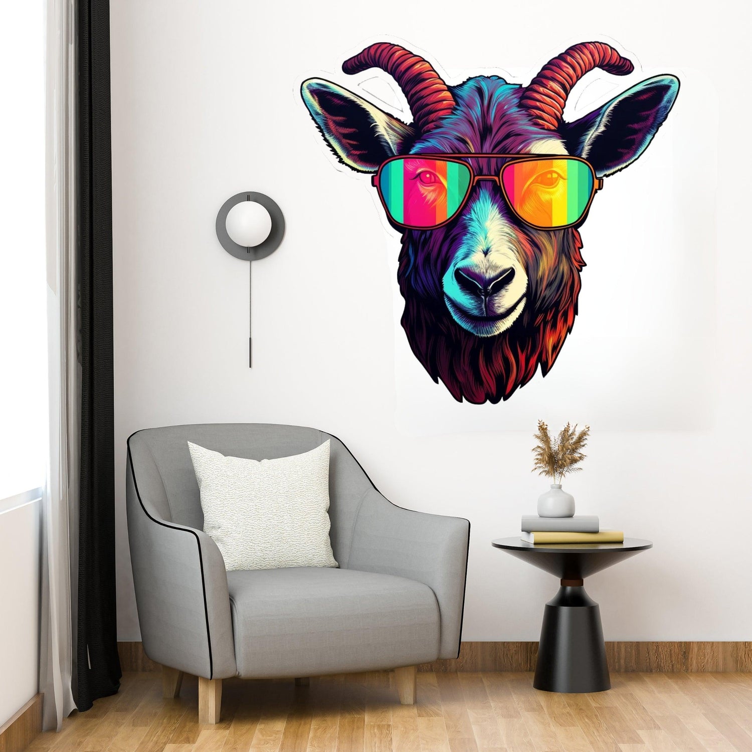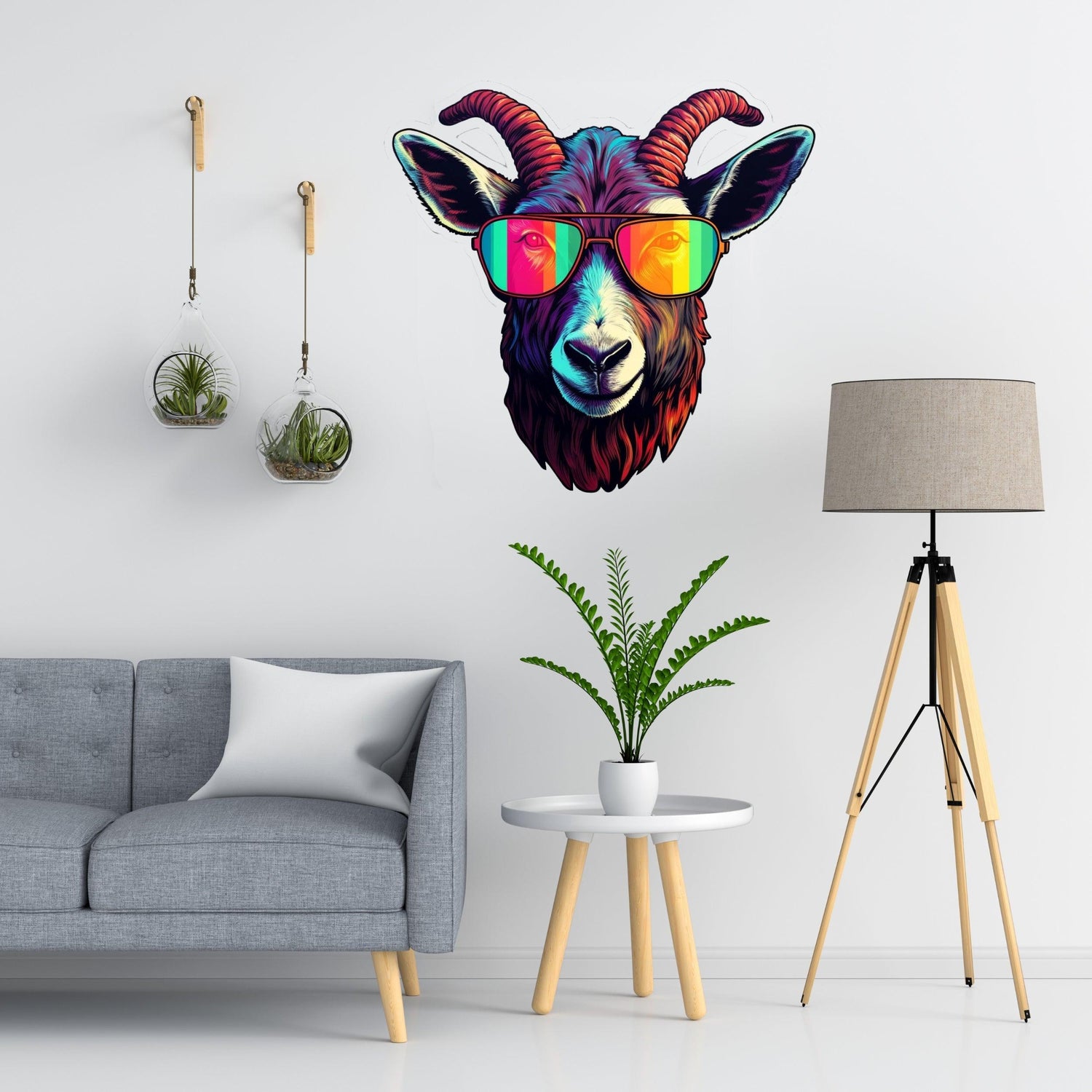 Colorful avant-garde goat wall decal with sunglasses, ideal for unique home decor.