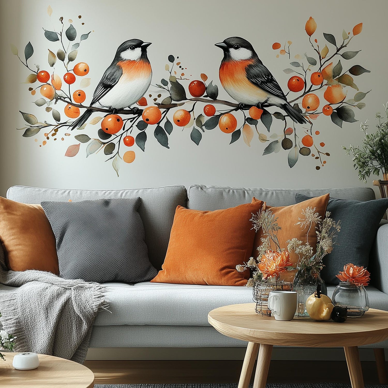 Autumn bird wall decal featuring two birds and orange berries above a cozy couch with orange and gray cushions.