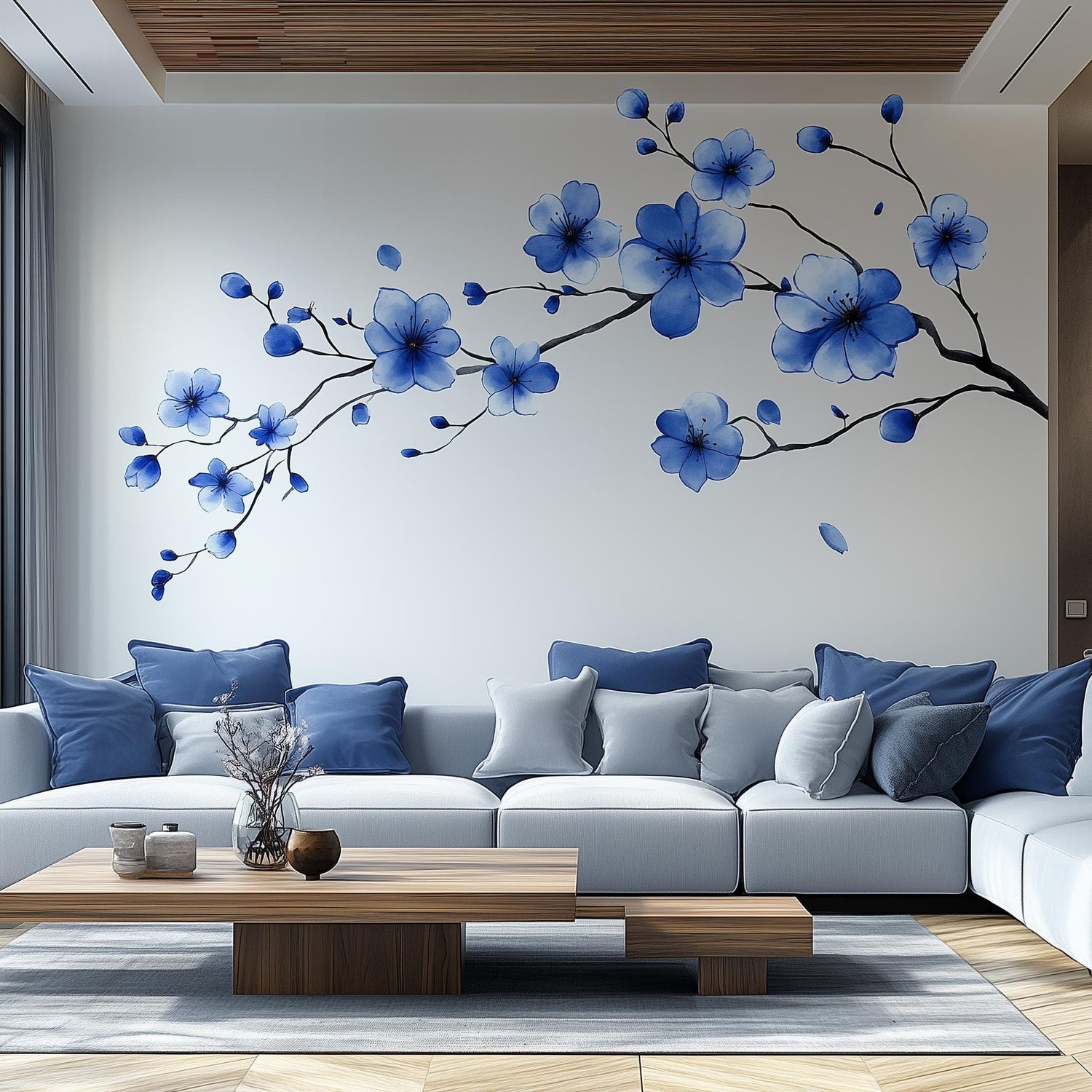 Blue Flower Branch Wall Decal | Large Sakura Floral Vinyl Sticker | Removable Nature Art for Living Room, Bedroom, Office, Modern Home Décor