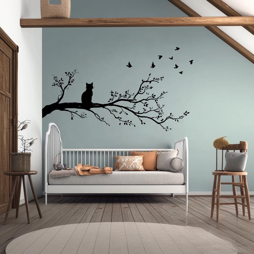 This elegant vinyl wall decal features a peaceful silhouette of a cat sitting quietly on a tree branch, surrounded by fluttering birds. It brings a calm and whimsical touch to any space and is especially charming in nurseries, bedrooms, or reading corners.