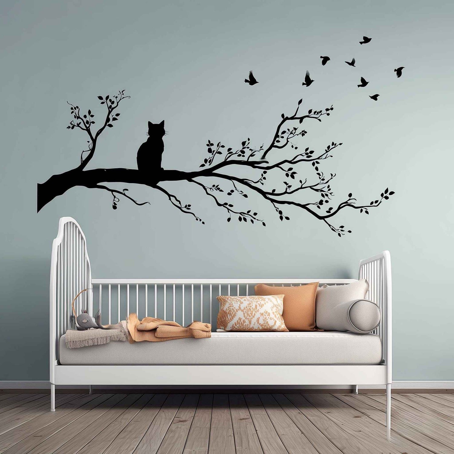 Cat on Tree Branch Wall Decal | Vinyl Cat and Birds Sticker | Nature Wall Decor | Cat Silhouette Wall Art | Tree Wall Sticker for Nursery