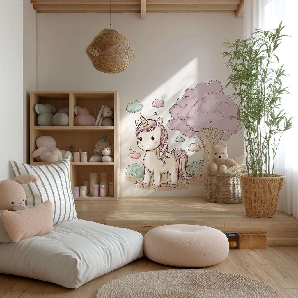 This charming pastel decal features a sweet cartoon-style unicorn with soft pink and cream tones, standing beside a whimsical tree and surrounded by fluffy clouds and stars. Itās the perfect wall accent for nurseries, girlsā bedrooms, or play areas.