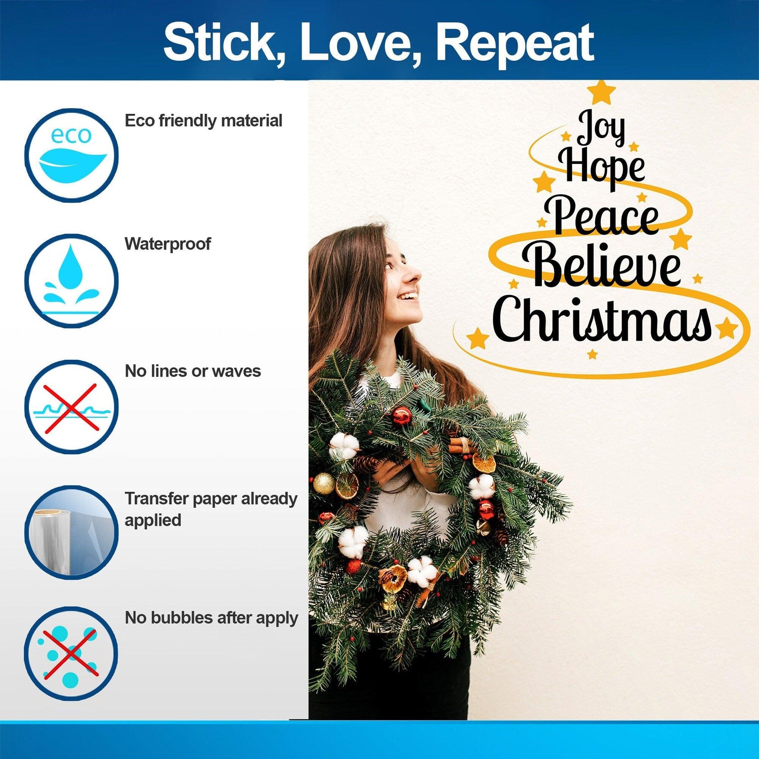 This wall decal is more than just a decoration; it's a celebration of the hopeful and joyous spirit of Christmas. The "Joy Hope Peace Believe Christmas" message serves as a heartfelt reminder of the happiness and love that fill the holiday season, making it a cherished decor piece for years to come.