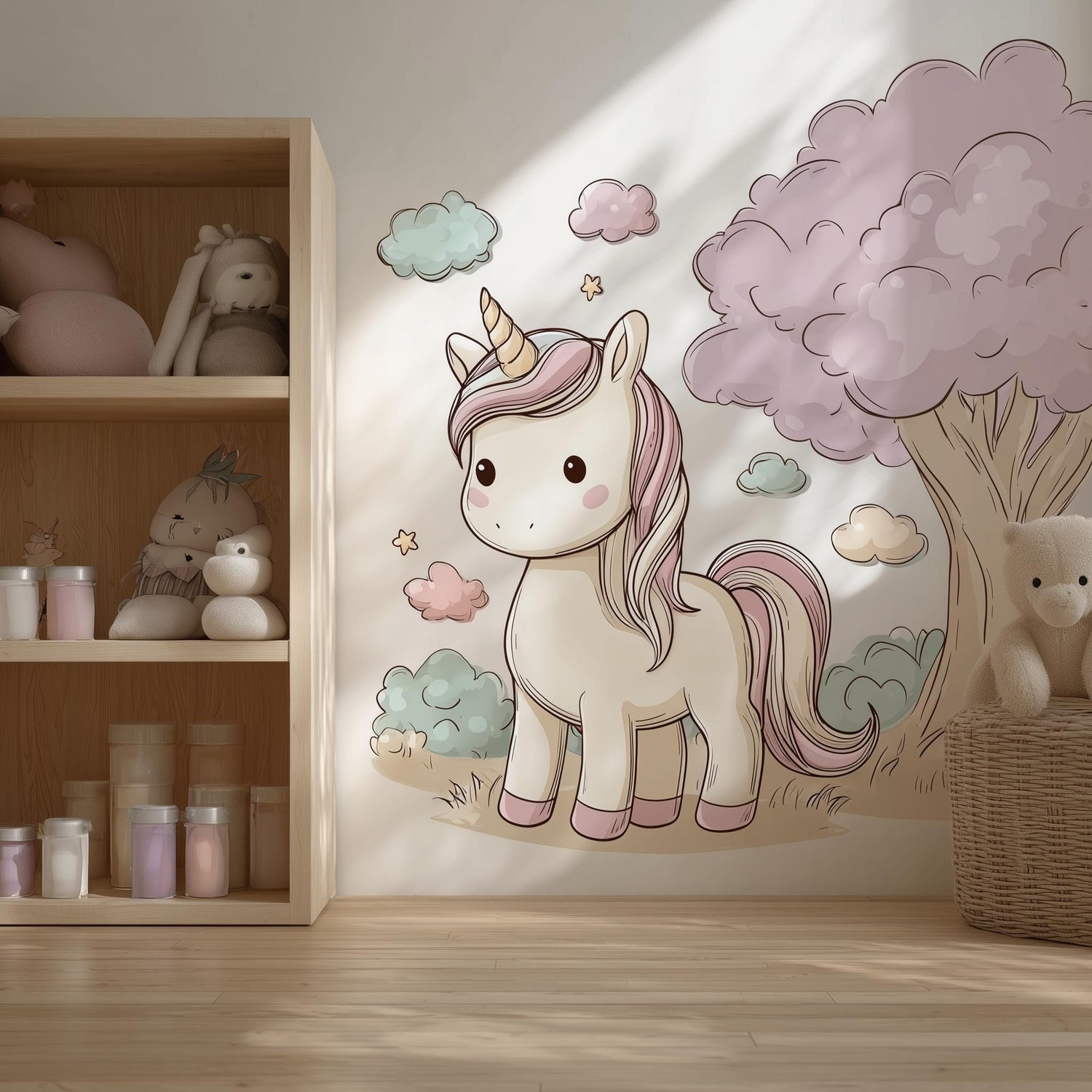 This charming pastel decal features a sweet cartoon-style unicorn with soft pink and cream tones, standing beside a whimsical tree and surrounded by fluffy clouds and stars. Itās the perfect wall accent for nurseries, girlsā bedrooms, or play areas.