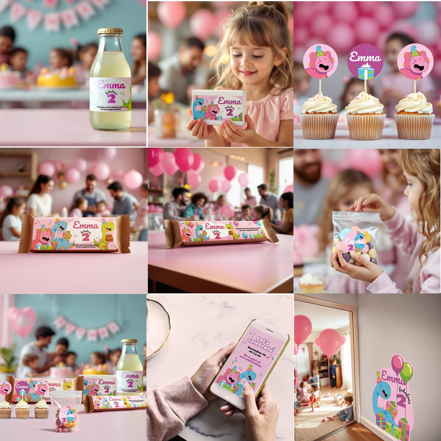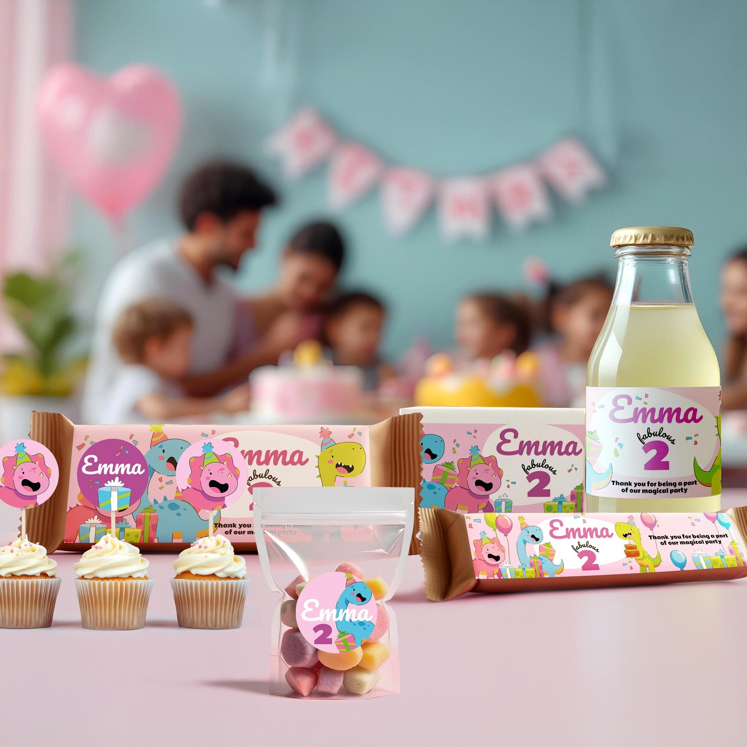 Add a fun, personalized touch to your child's birthday party with this dinosaur-themed sticker set! Perfect for creating a cohesive and delightful party experience, this set includes customizable stickers for bottles, chocolate bars, candy bars, boxes, cake toppers, and more! Mothers can personalize each sticker with the child’s name, age, or custom message, or choose to leave them blank.