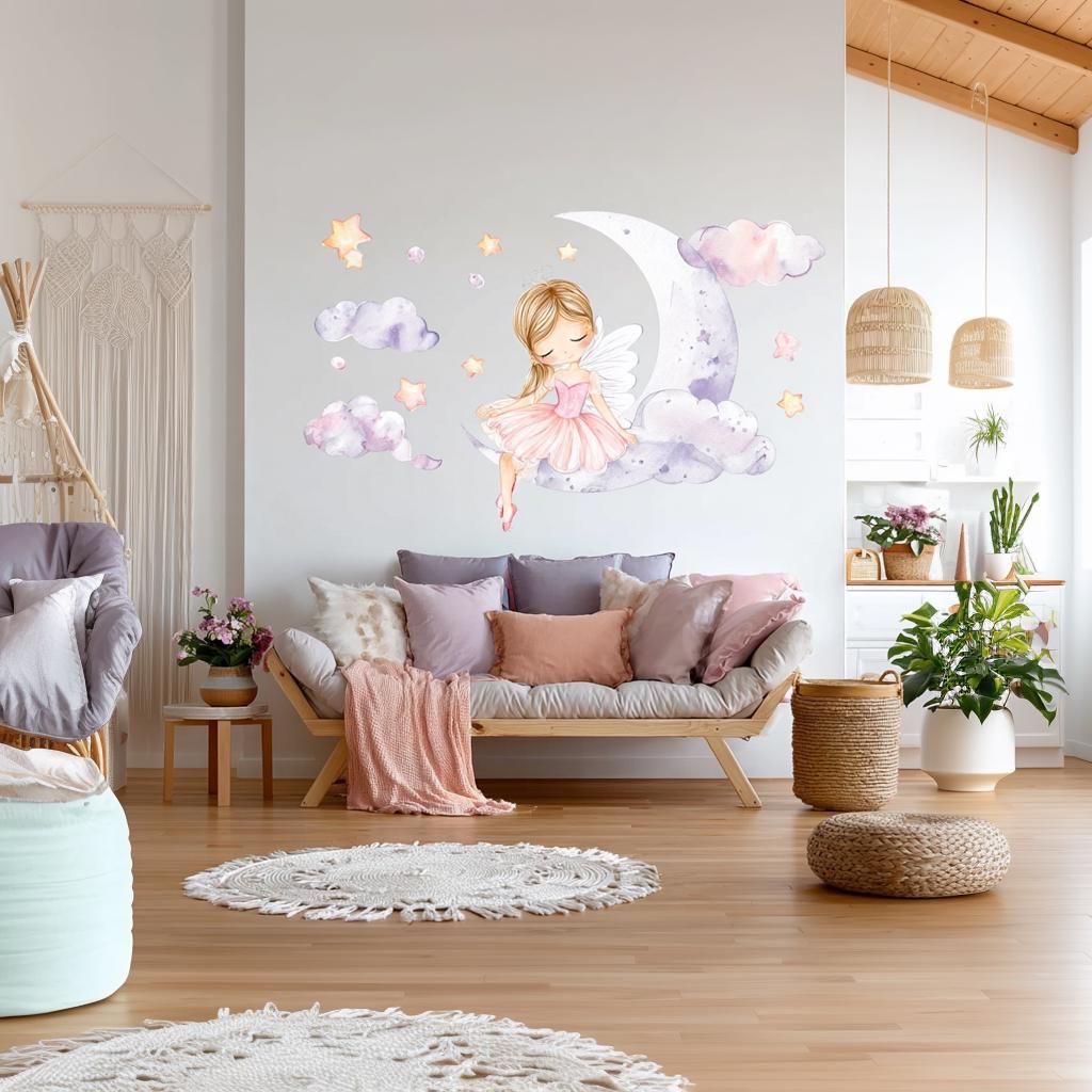 Add a magical touch to your baby girl's nursery with this dreamy Fairy Ballerina wall decal. Featuring a sweet little princess sitting on a crescent moon surrounded by soft watercolor clouds and glowing stars, this wall sticker creates a soothing and whimsical atmosphere.