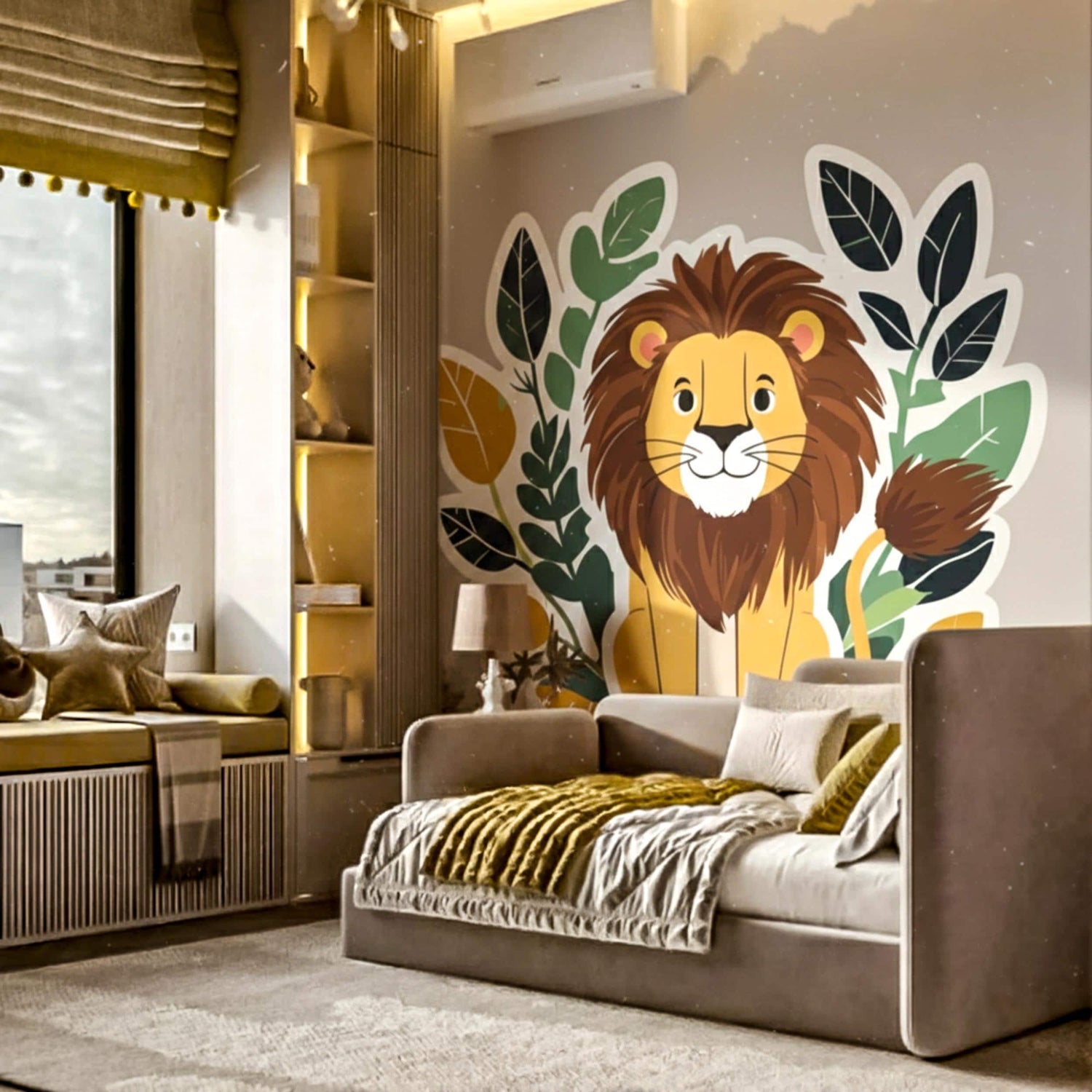 * Bold Focal Point: The lion's friendly face and colorful leaf accents create an instant center of attention for the room.