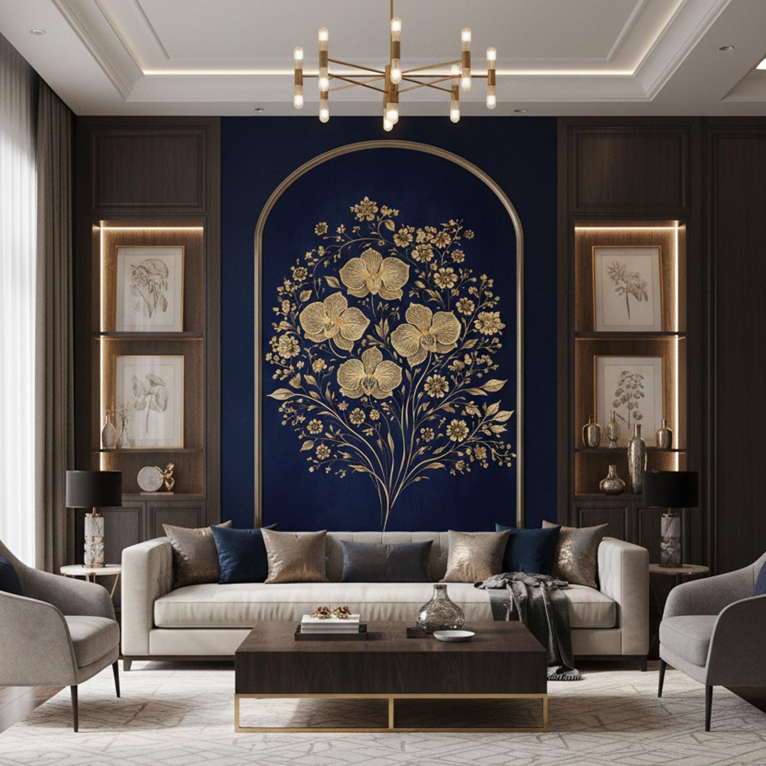 A structural arched panel in deep navy blue featuring an elegant arrangement of golden orchids and delicate blooms spilling over the edges.