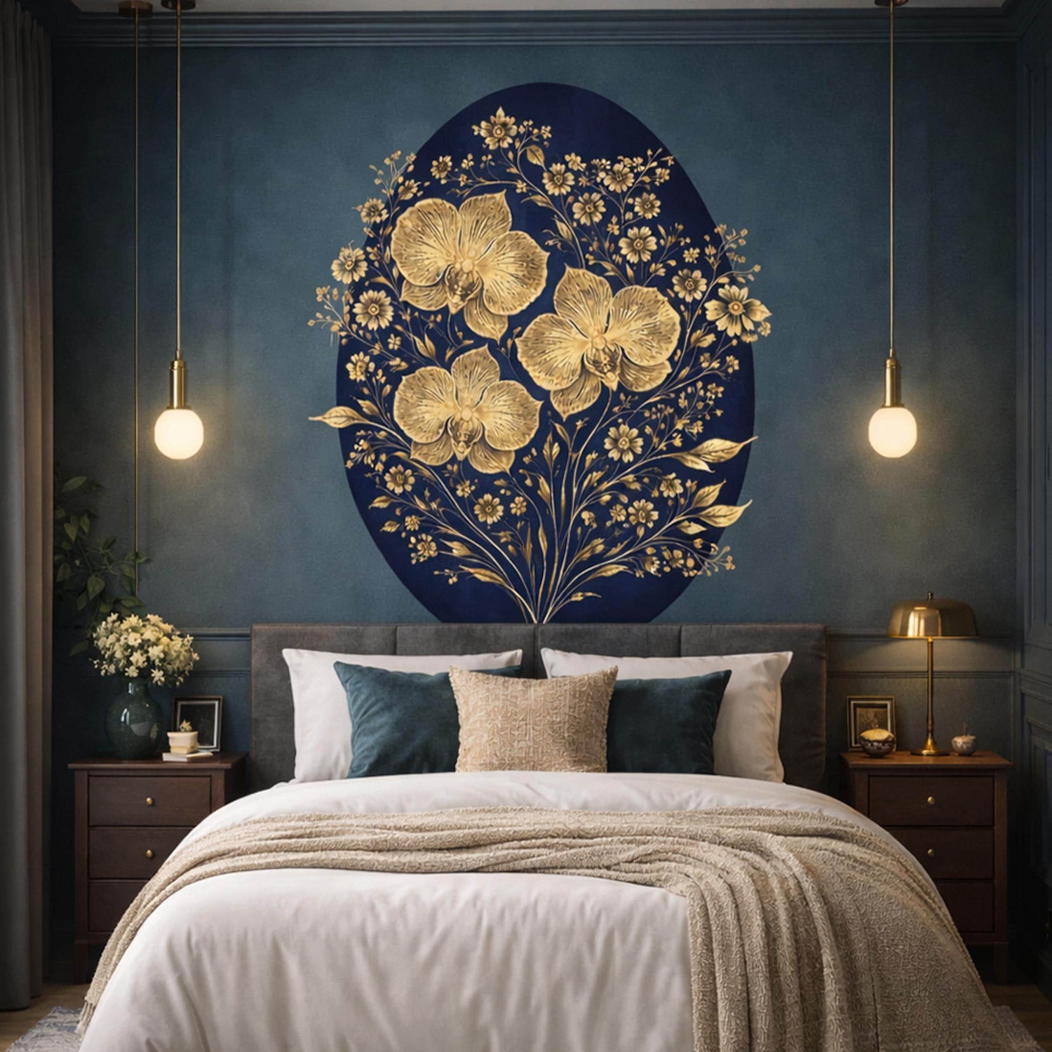 Infuse your space with a touch of timeless luxury. This exquisite illustration features shimmering golden orchids and delicate accent flowers set beautifully against a rich navy blue oval. The high-contrast palette and intricate line work create a sophisticated focal point that brings a boutique, high-end feel to any room.