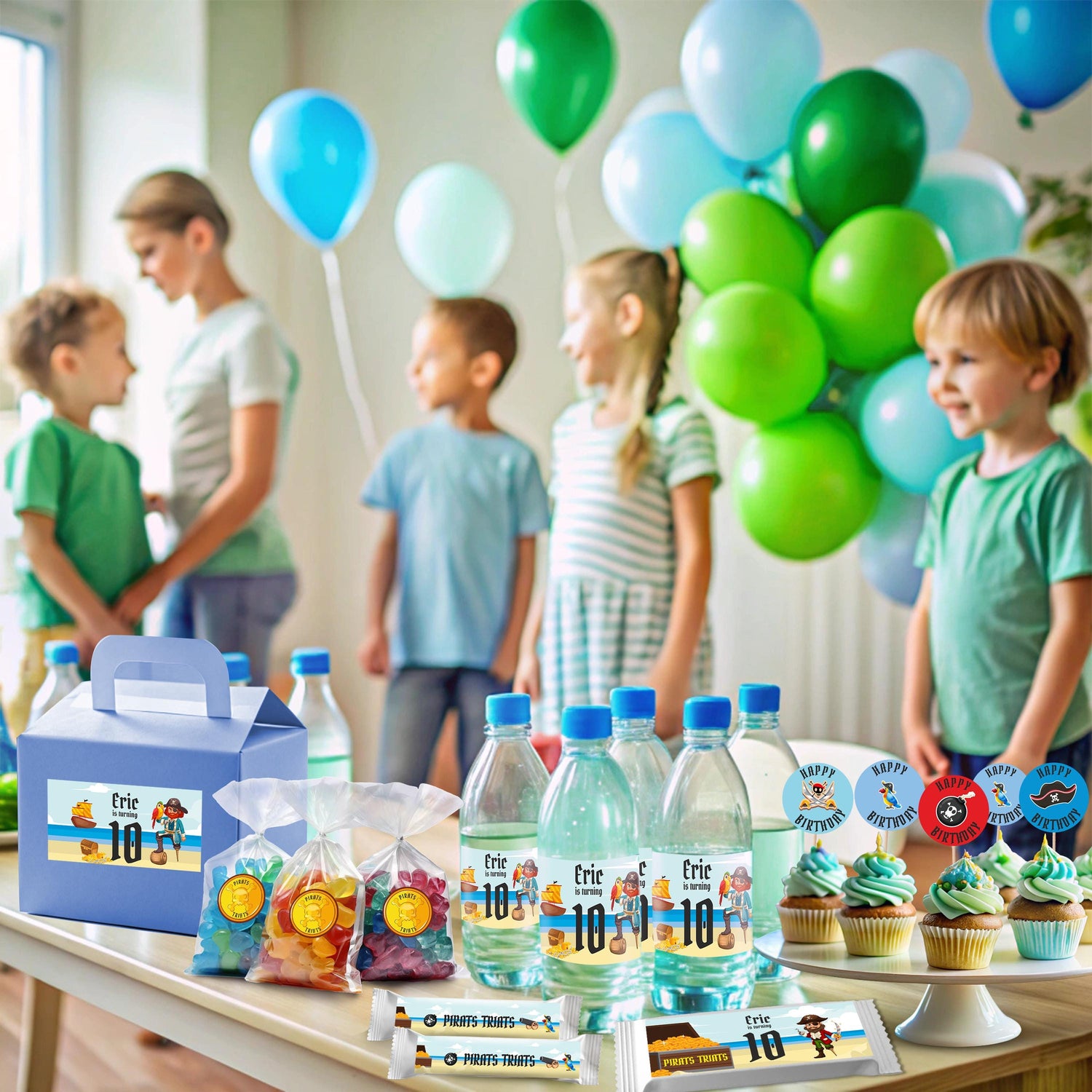 Ahoy, matey! Make your child’s pirate birthday party an adventure to remember with this fun and customizable decal set! Perfect for any young pirate, this set includes decals for drinks, candy, favor boxes, and more, helping you create an unforgettable treasure-filled celebration. Each decal can be personalized with the birthday child’s name, age, or a custom message. Choose the quantity that fits your guest list, and add a large wall decal for an epic photo backdrop.