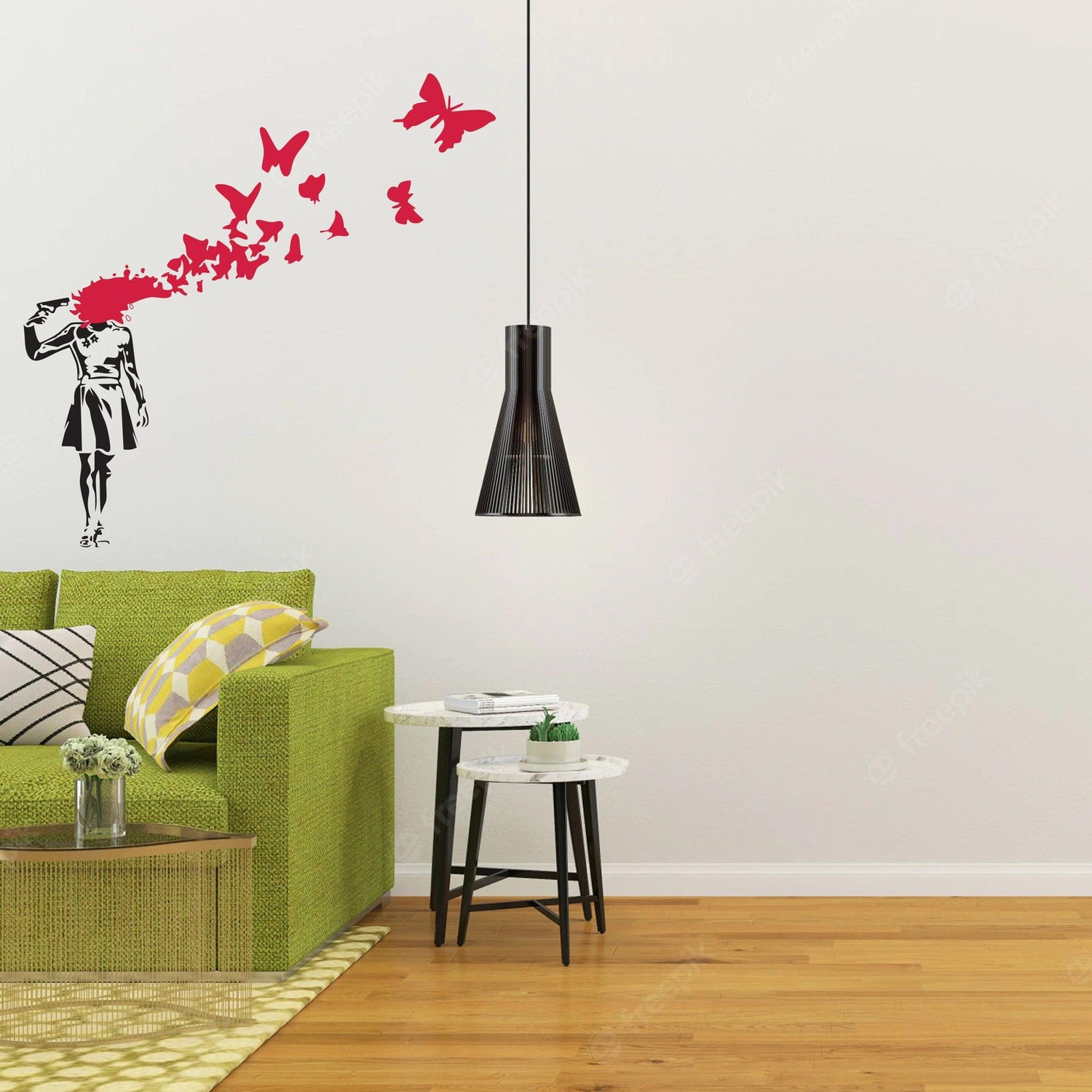Banksy-style wall decal of a girl with a gun, colorful butterflies emerging, stylish room decor.