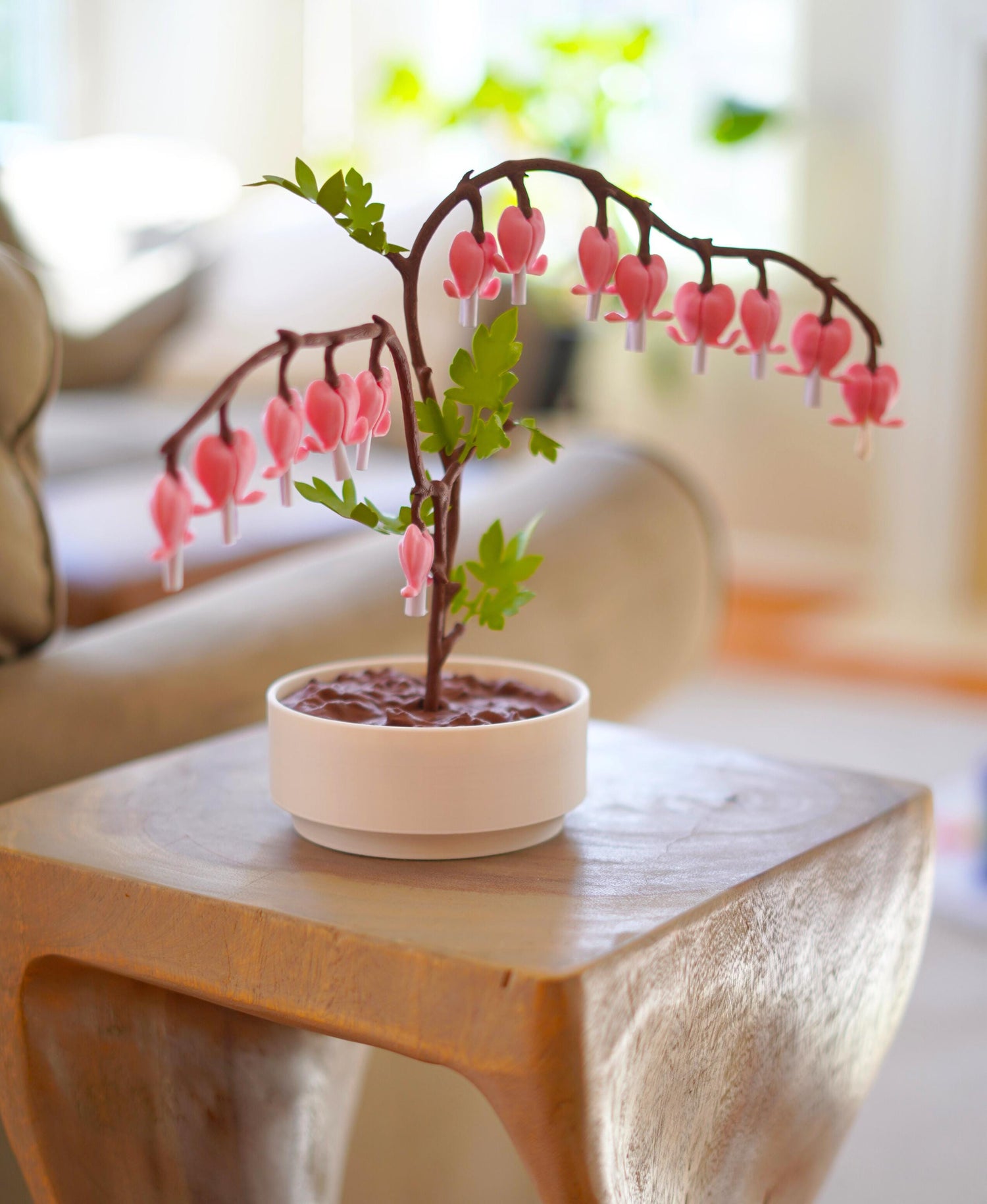 - **Lifelike Details:** The design mimics the iconic pink blossoms and lush green leaves of a bleeding heart plant, making it a striking centerpiece.