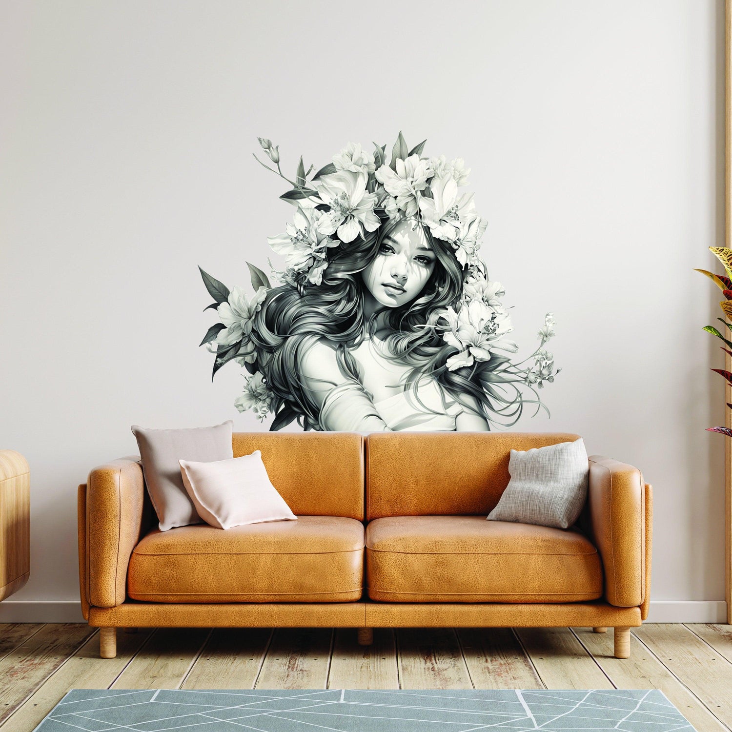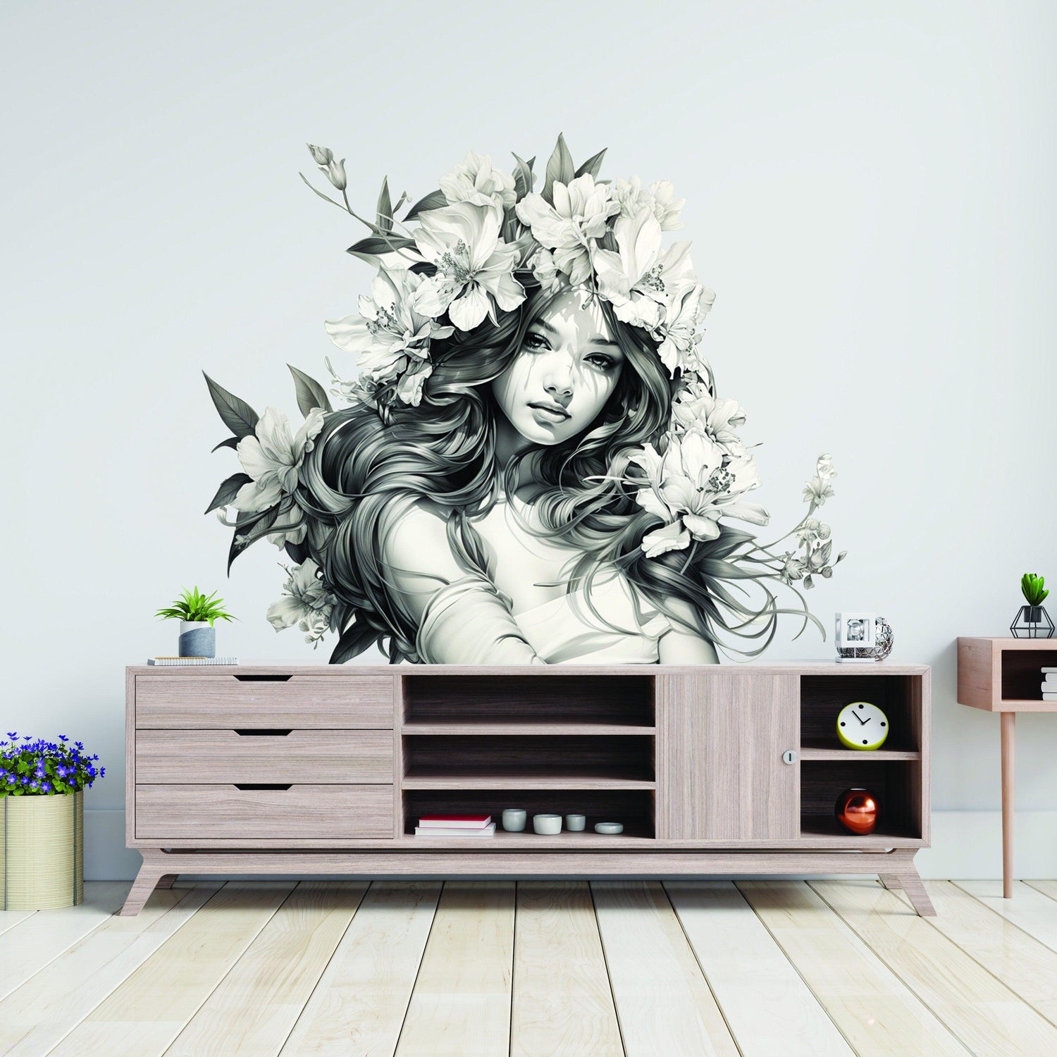 Stunning Woman with Floral Hair Wall Decal - Elegant Teen Vinyl Art Mural