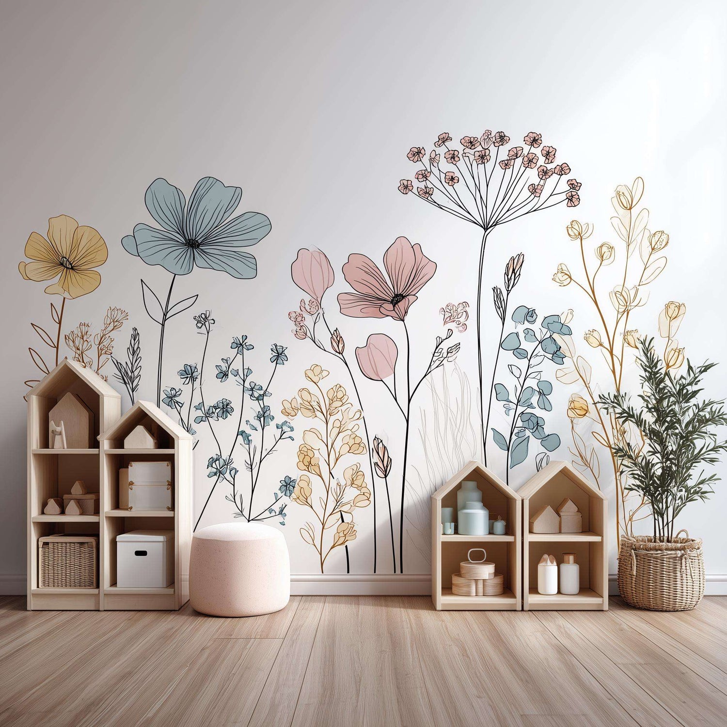 A stylish children's room with pastel-colored floral line art wall decals behind toy shelves. The design features tall hand-drawn flowers in soft pink, blue, yellow, and tan tones, adding a calming, boho feel to the space.