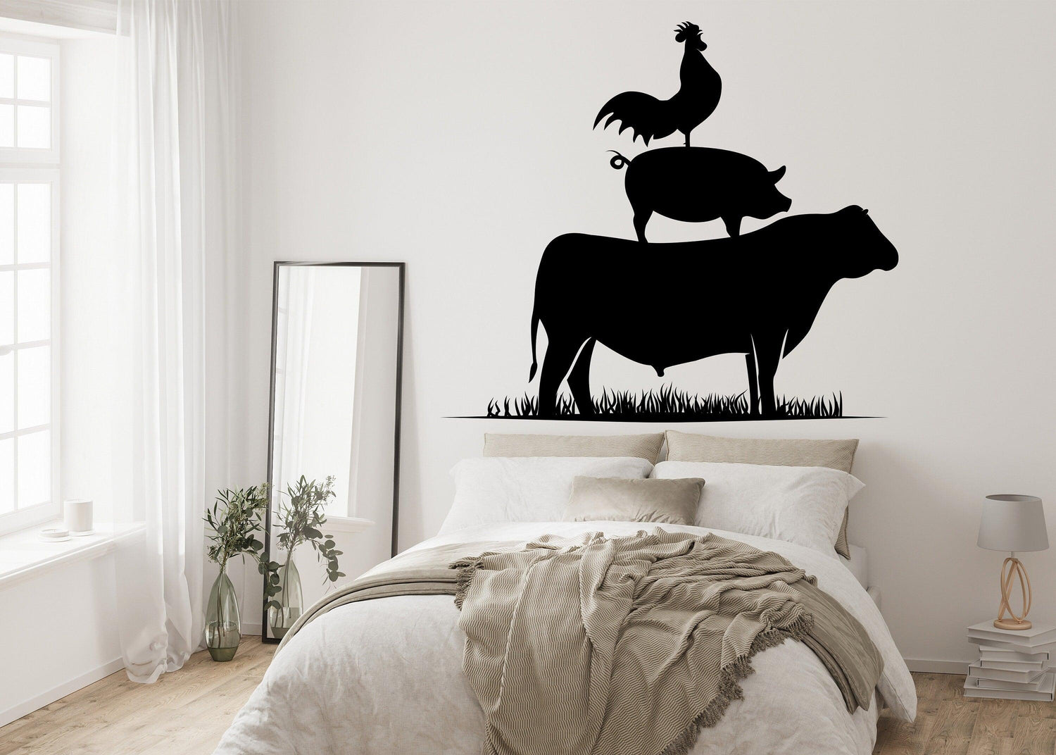 Silhouette wall sticker of a rooster, pig, and cow on a wall in a child's room, adding farm charm to decor.