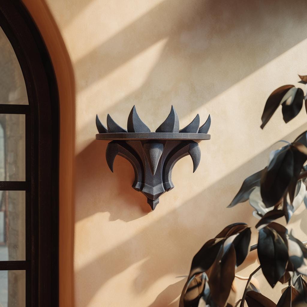 3D Printed Gothic Flame Wall Shelf | Dark Fantasy Spiked Ledge | Black PLA Floating Display for Living Room, Bedroom or Game Room Decor