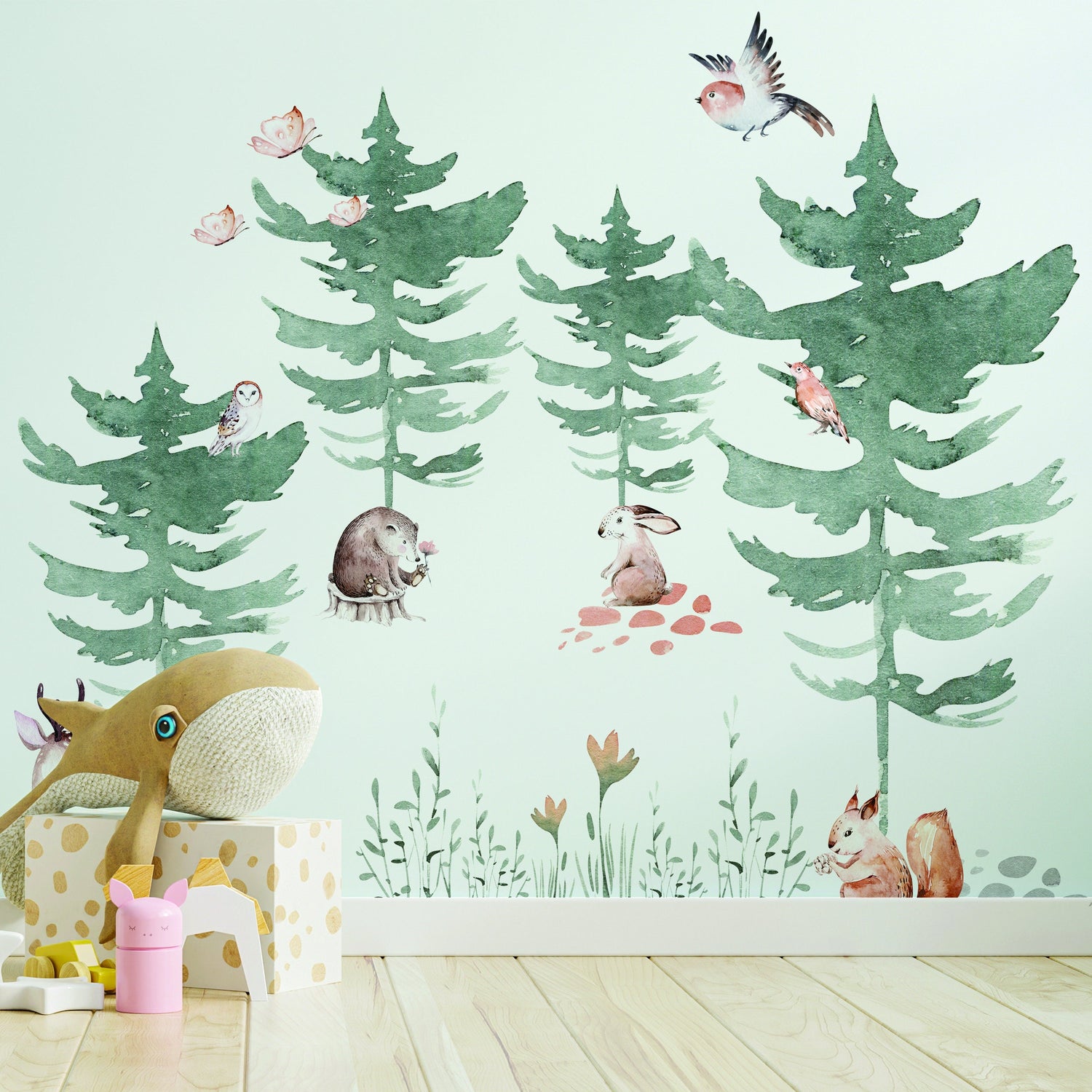 Wir präsentieren Ihnen unseren Wandaufkleber mit Waldtieren und Bäumen für das Kinderzimmer.