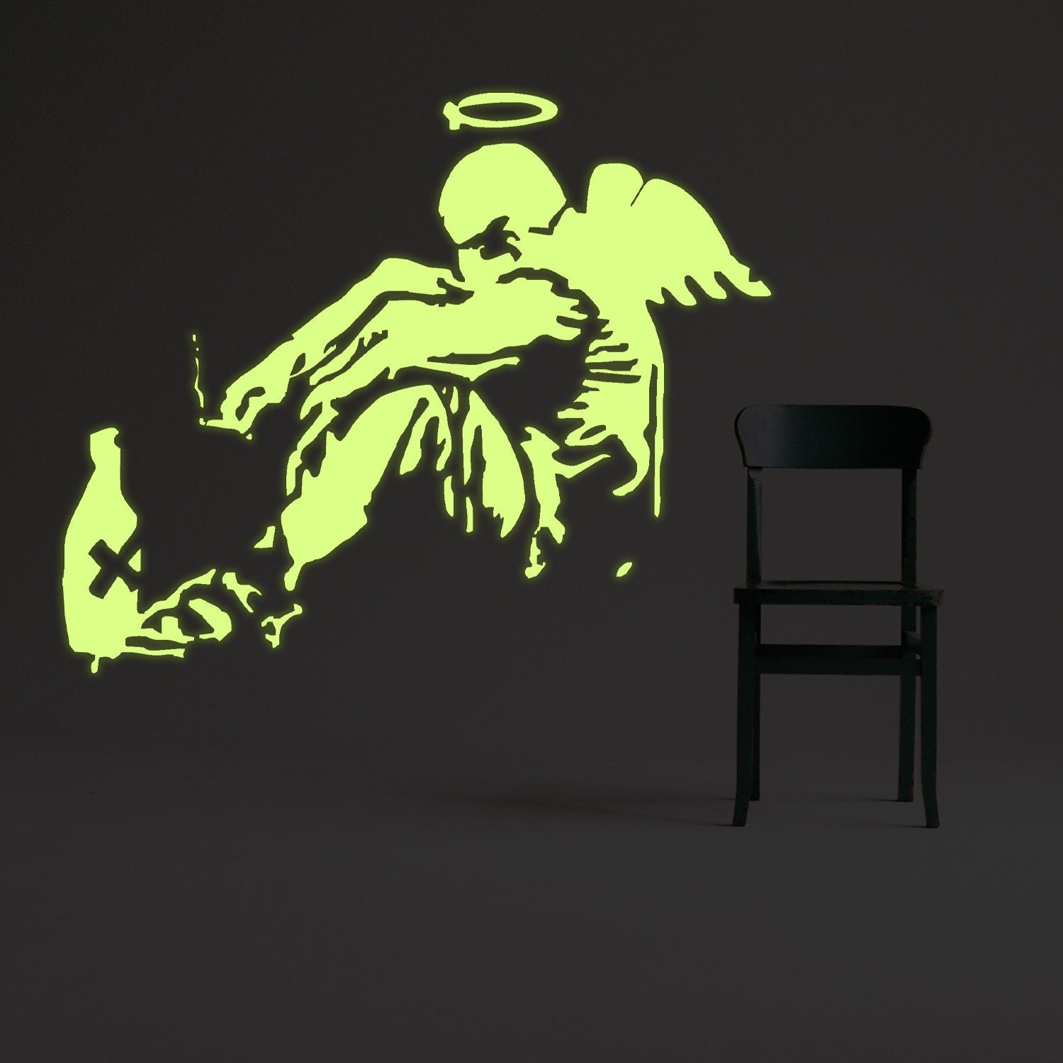 Der im Dunkeln leuchtende Wandaufkleber „Fallen Angel“ von Banksy ist ein einzigartiger Blickfang für jeden Raum. Dieser riesige Straßengraffiti-Aufkleber zeigt das ikonische Bild von Banksys gefallenem Engel mit leuchtenden Flügeln und ist damit ein perfektes Statement für jeden urbanen oder zeitgenössischen Raum.