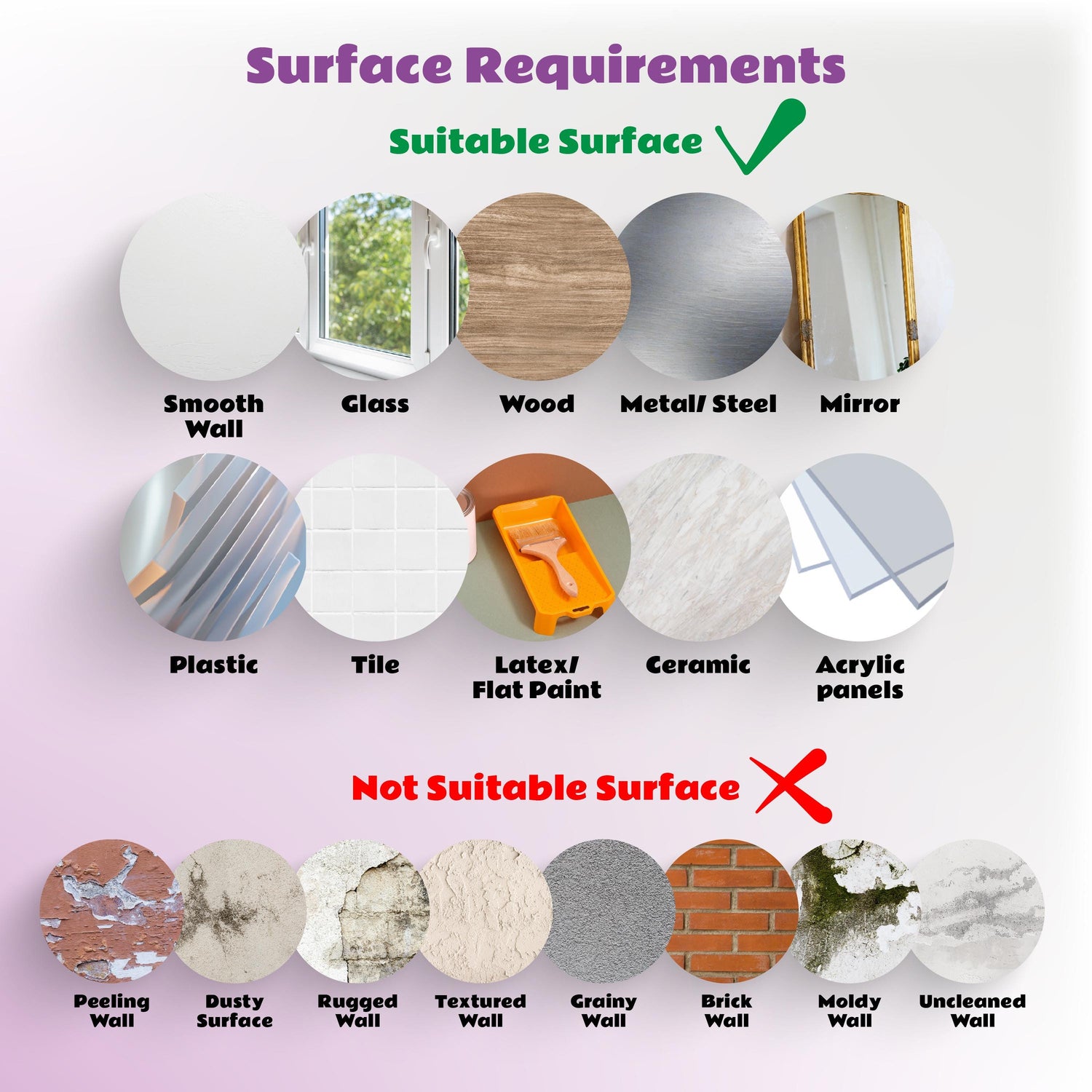 - Oberflächenvorbereitung: Die Oberfläche sollte sauber, trocken und frei von Staub oder Fett sein. Wischen Sie die Wand mit einem trockenen Tuch ab und lassen Sie frisch gestrichene Oberflächen mindestens 3-4 Wochen aushärten, bevor Sie den Aufkleber anbringen.