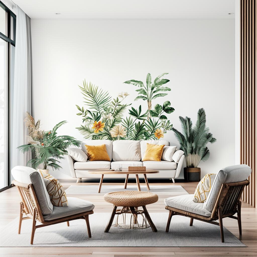 Botaaniline seinakleebis | Troopiliste lehtede ja lilledega seinakleebis | Eemaldatav loodusest inspireeritud seinakunst elutoa, magamistoa või kontori sisekujunduseks
