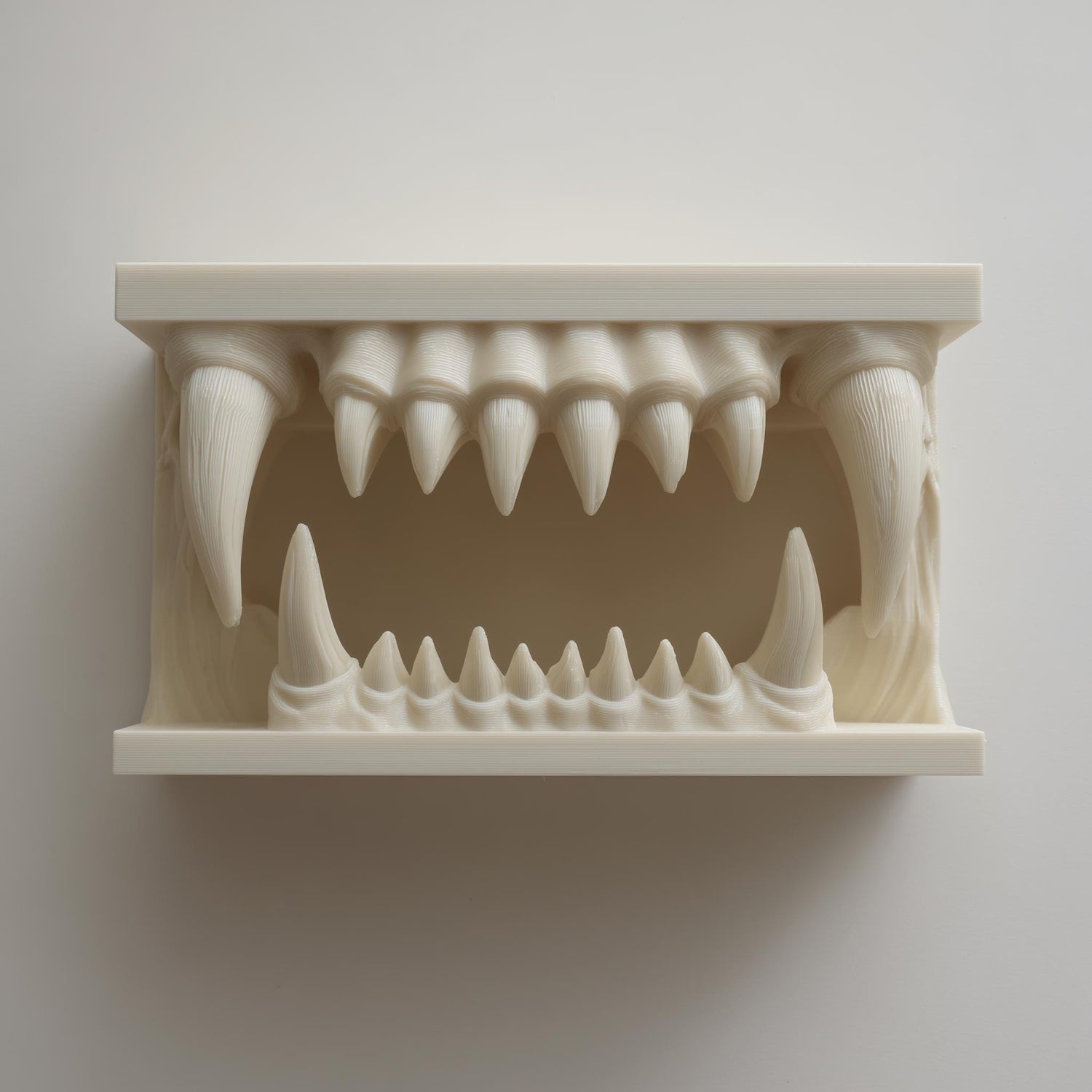 * Monster jaw design with upper and lower fangs framing a dramatic display space