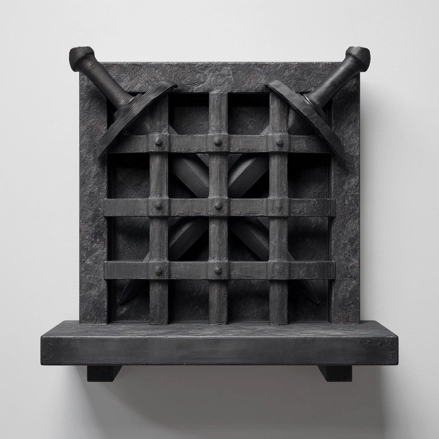 This 3D printed wall shelf combines decor and play: a small display ledge set in front of a barred “gate” with two decorative swords stored behind the lattice. Each sword can be fully removed from the holder – blade and handle slide out from behind the grid – so you can display them crossed, hold them as props