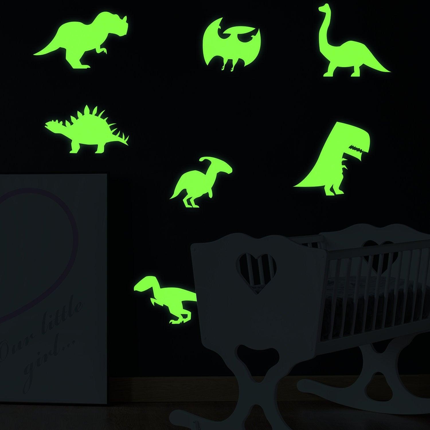 Glow in dark dinosaur wall decals in a boy's room, featuring various dinosaur designs around a crib.