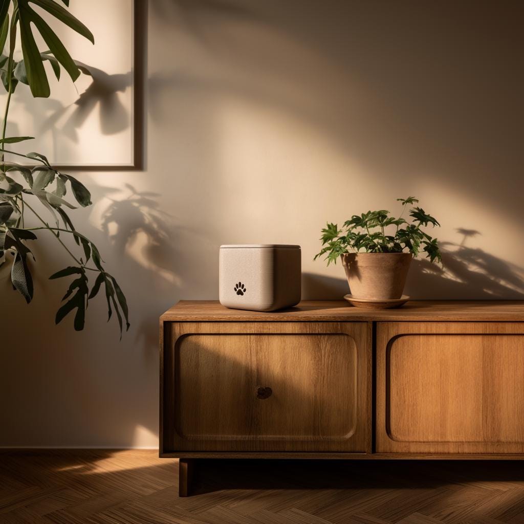Square minimalist 3D printed pet cremation urn with a small paw print, placed on a wooden cabinet in a warm, modern interior.