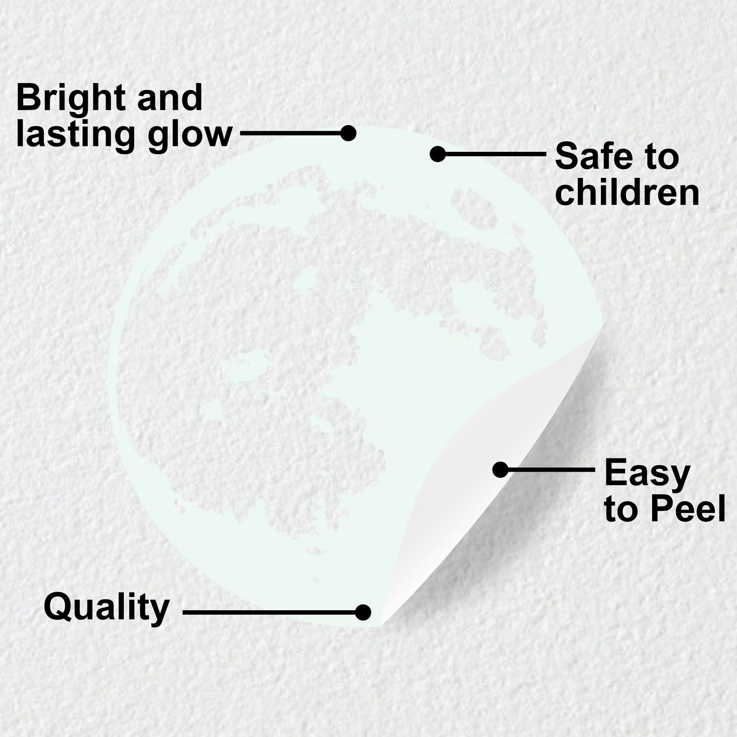 Kleebis on mõeldud lakke kinnitamiseks, jättes illusiooni pea kohal hõljuvast helendavast kuust. Samuti sobib see suurepäraselt tähistaeva öötaeva efekti loomiseks kombineerituna teiste pimedas helendavate kleebistega. Kuu pehme kuma loob lohutava ja rahustava õhkkonna, mistõttu sobib see ideaalselt lastetuppa.