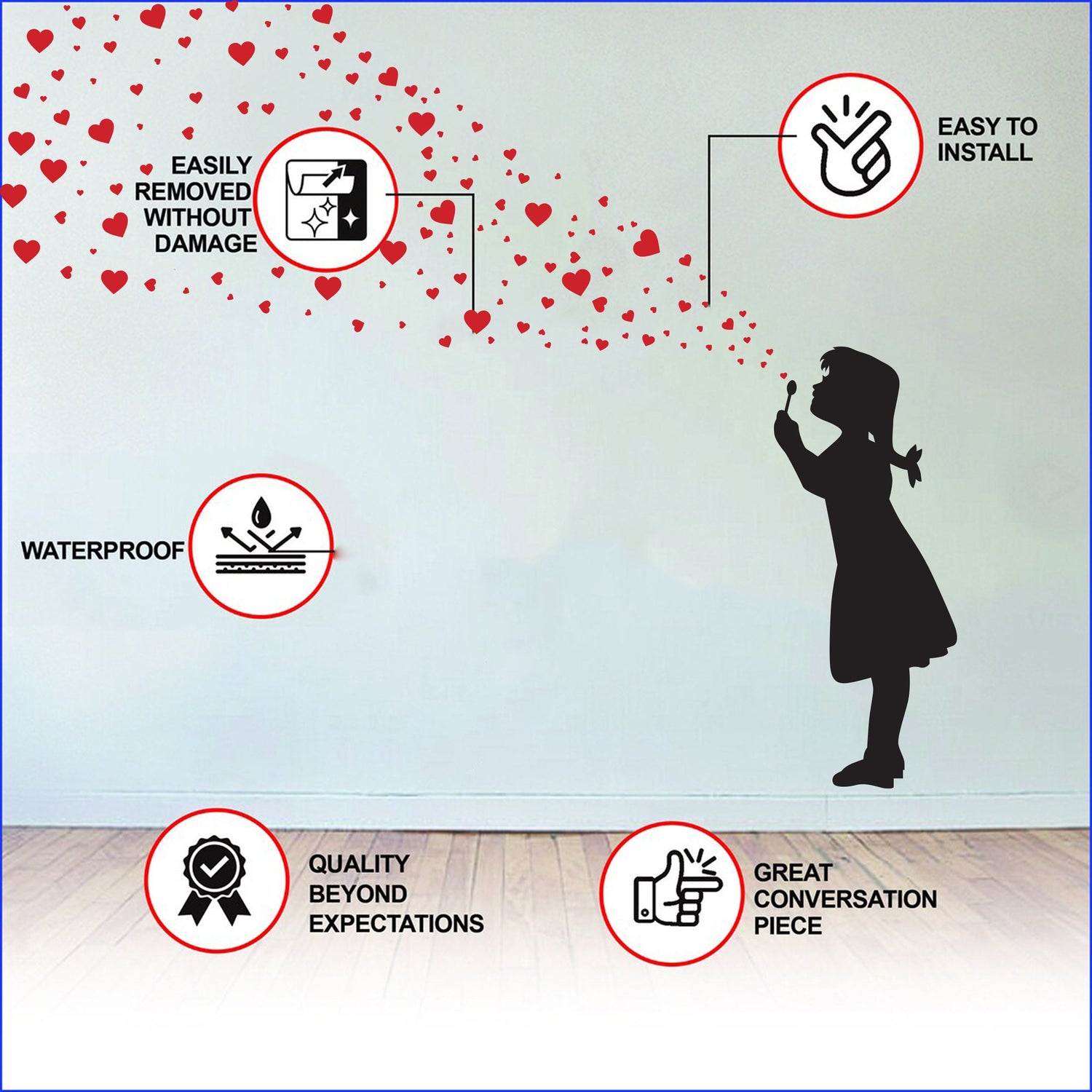 Ükskõik, kas olete tänavakunsti fänn või lihtsalt otsite oma toale lõbusat ja mängulist lisa, Heart Bubbles Girl seinakleebis on ideaalne valik. See on suurepärane viis oma kodule või kontorile unikaalse ja isikupärase hõngu lisamiseks ning on kindlasti vestluse algataja. Ärge jätke kasutamata seda ainulaadset toodet, mis on nüüd saadaval saidil Decords.com.