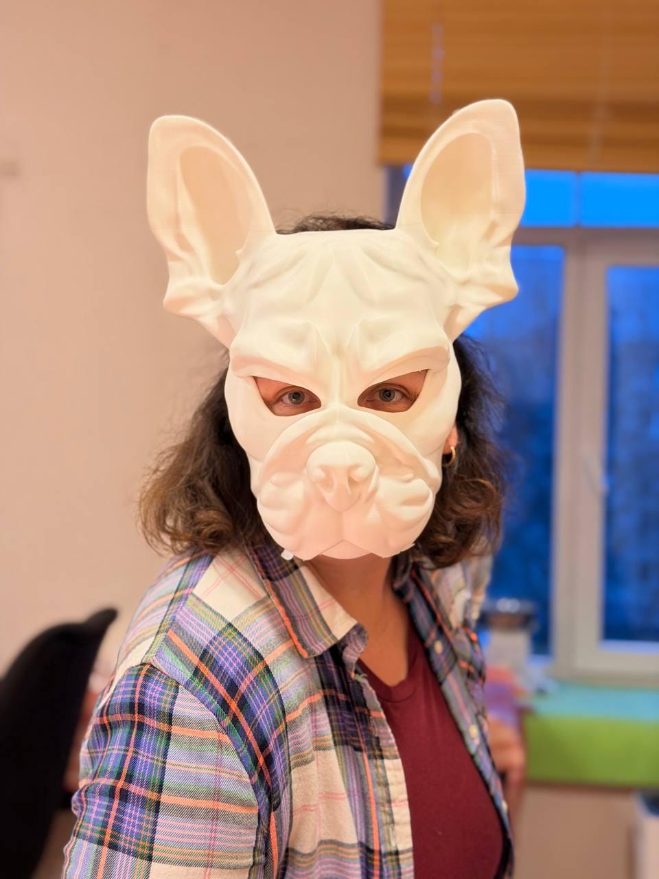 This 3D printed bulldog mask features a modern sculptural design inspired by the strong yet charming character of a French bulldog. With clean geometric contours and expressive facial lines, it combines realism with artistic minimalism, making it perfect for cosplay, photography, or interior display.
