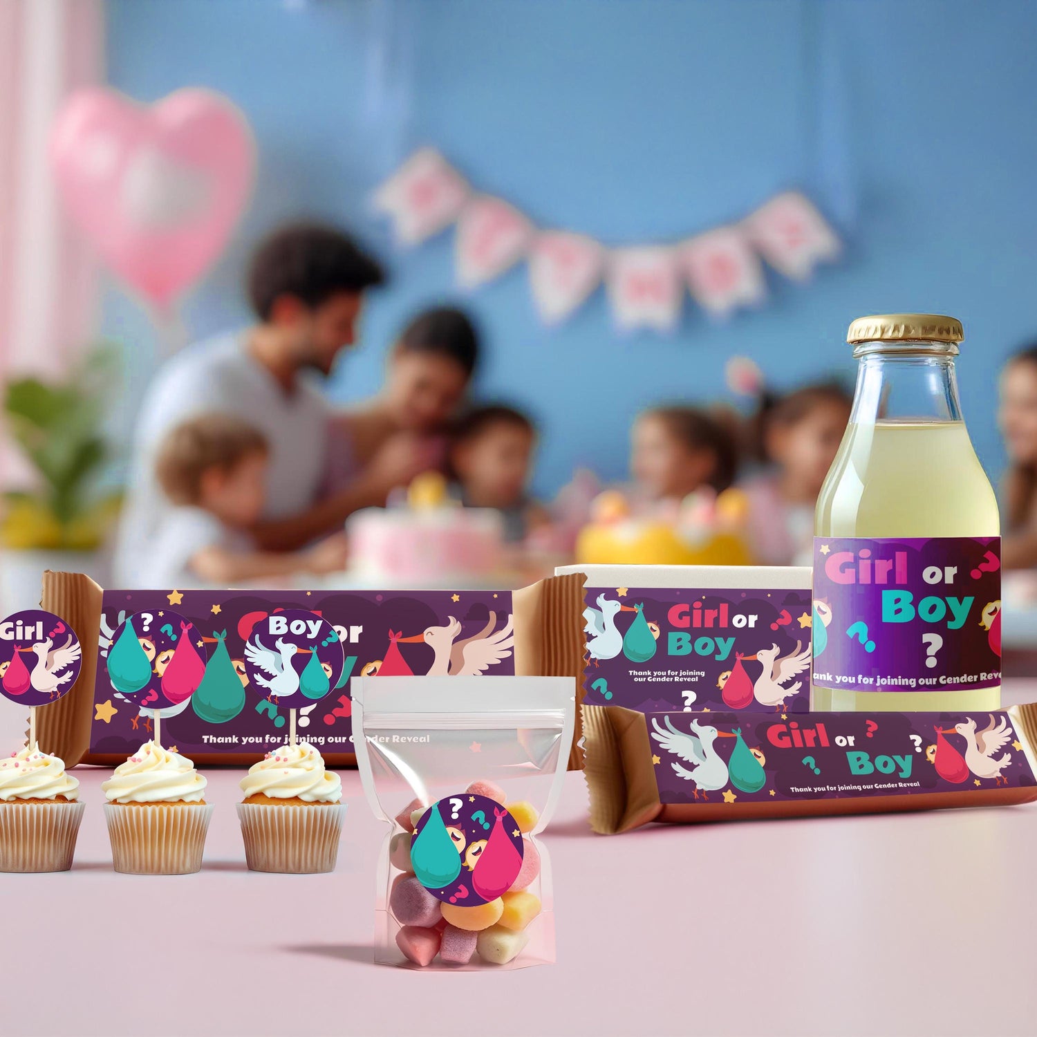 Gender Reveal Sticker Set | Personalized Boy or Girl Party Labels | Bottle, Chocolate, & Gift Box Stickers with Wall Decor *!