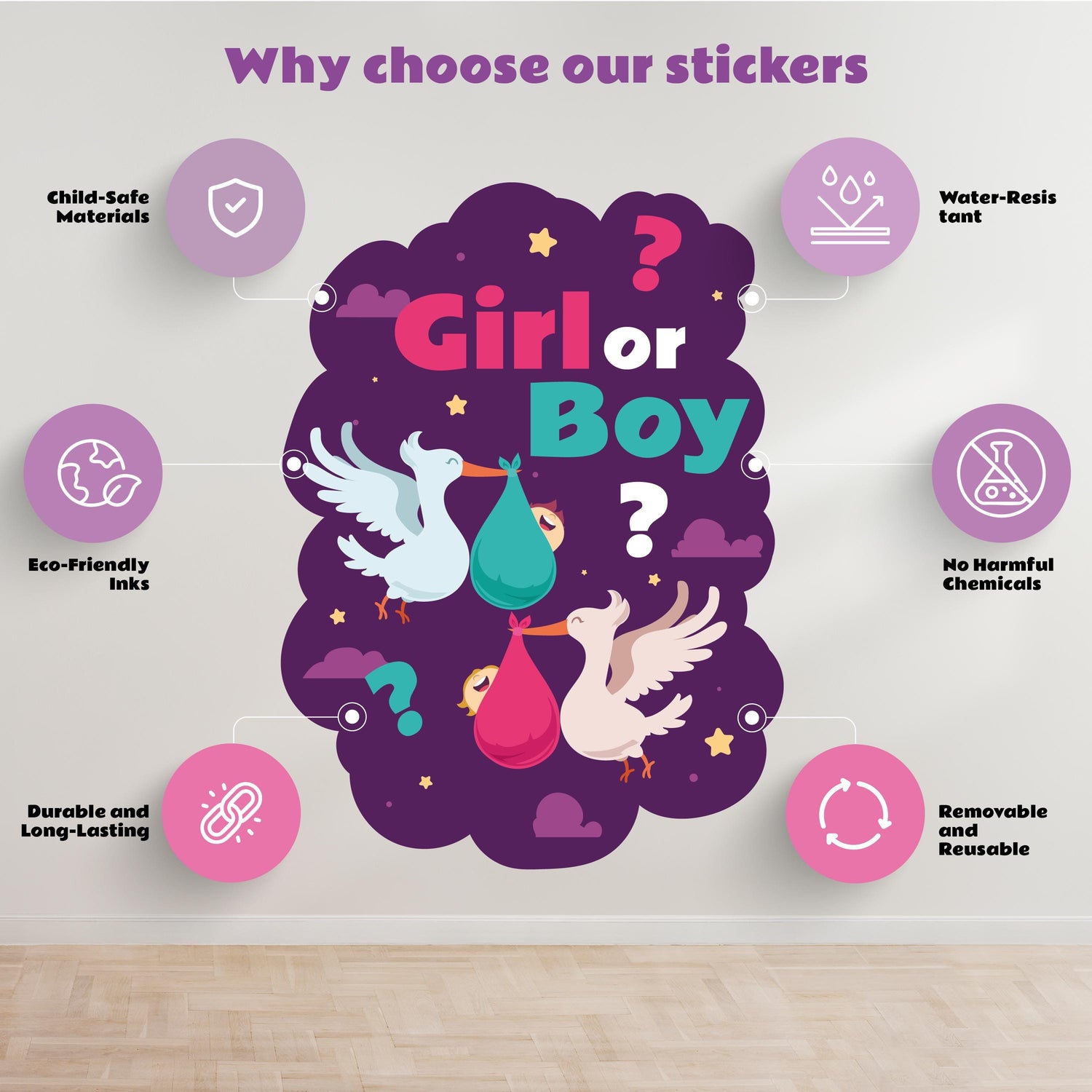 Add excitement to your gender reveal party with this whimsical "Girl or Boy" stork-themed wall sticker. Designed with vibrant colors, charming storks, and question marks, it creates the perfect backdrop for your baby shower celebration. This removable wall decal brings joy and anticipation while making your space party-ready in minutes.
