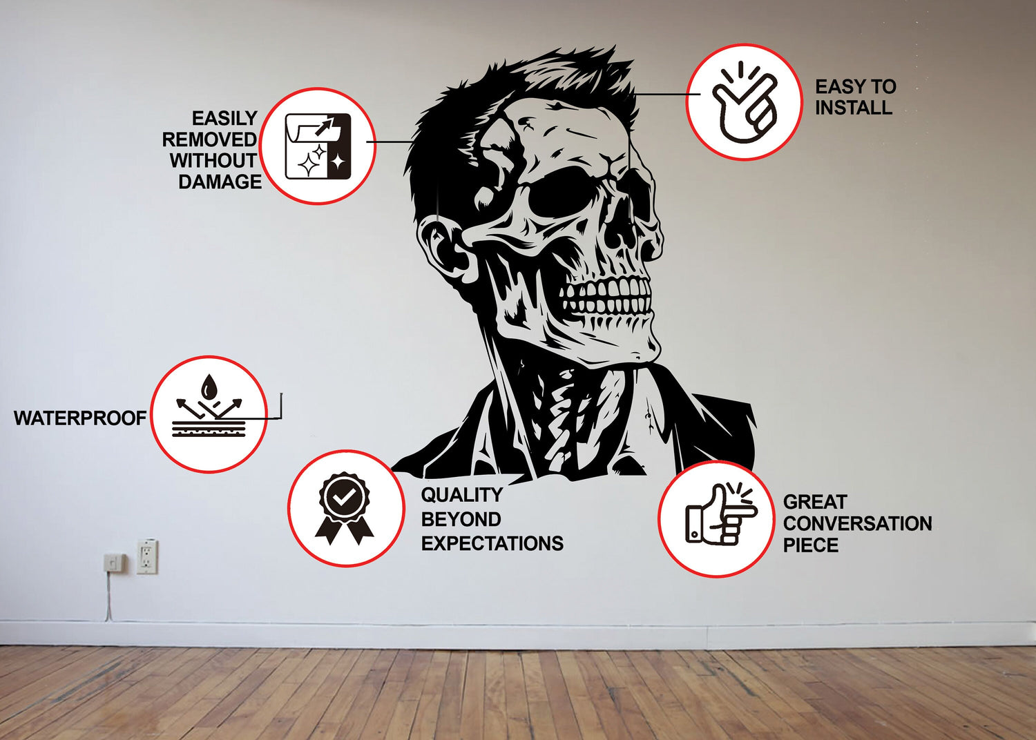 Turn heads and elicit smiles with this unique Halloween decor piece. Whether you're hosting a Halloween bash or just looking to amp up the ambiance in your space, our Skeleton Face Decal is the perfect addition. Order today and revel in the mix of business and horror!