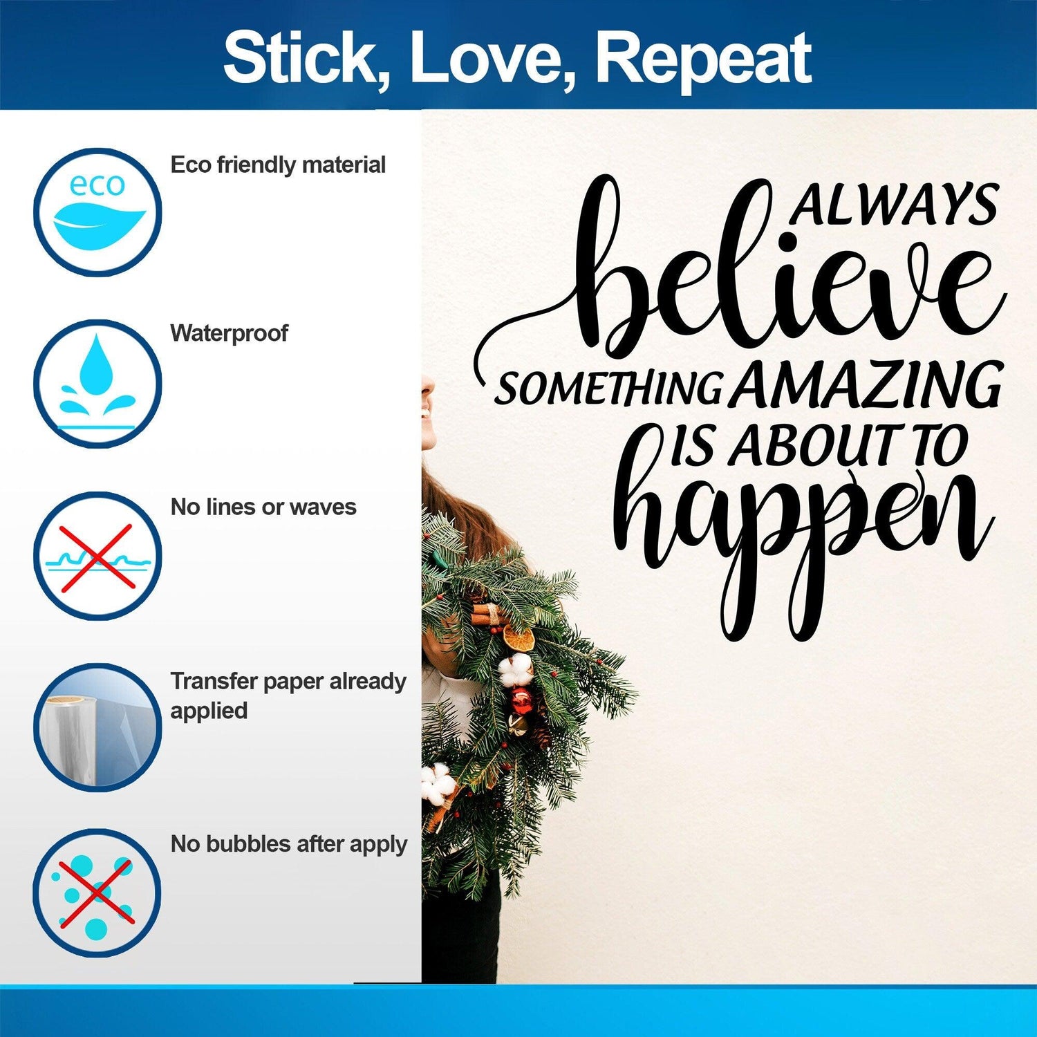 Perfectly suited for your living room or your child's room, this text decal sign effortlessly blends motivational allure with festive charm. It's a splendid way to add a touch of inspiration to your interior decor, encouraging a positive outlook and a hopeful spirit among your family and loved ones.