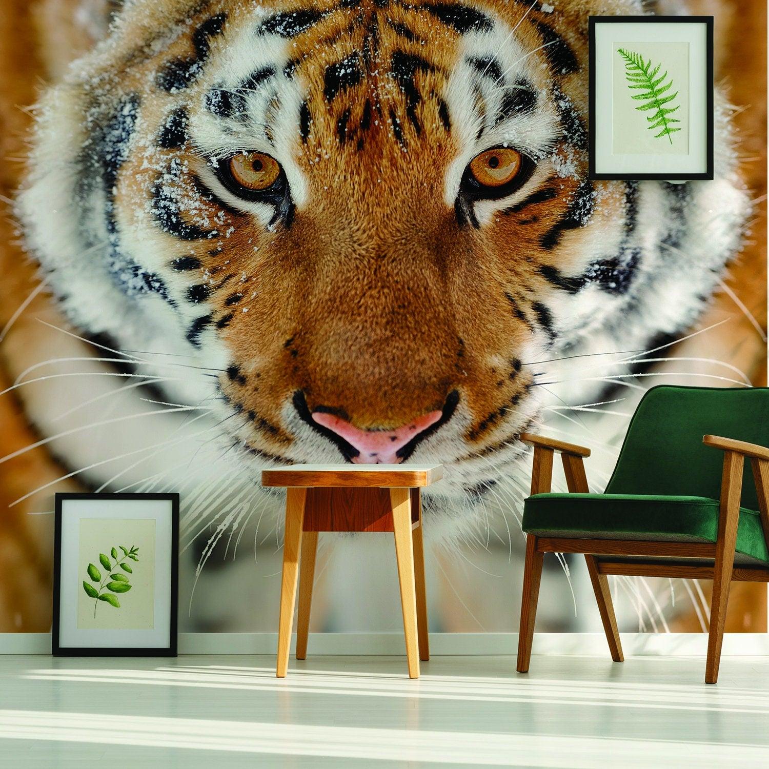 Not only is this decal visually stunning, but it is also versatile. It can be applied to any smooth surface, such as walls, doors, or furniture, making it a great option for adding a pop of personality to any room. The stick and peel feature allows for easy repositioning, so you can create the perfect layout for your space. Whether you want to add a bold statement to your living room or create a playful atmosphere in a child's bedroom, the Tiger Wallpaper Stick And Peel Decal is the perfect choice. Don't settle for plain walls, make a statement with this unique and eye-catching decal.