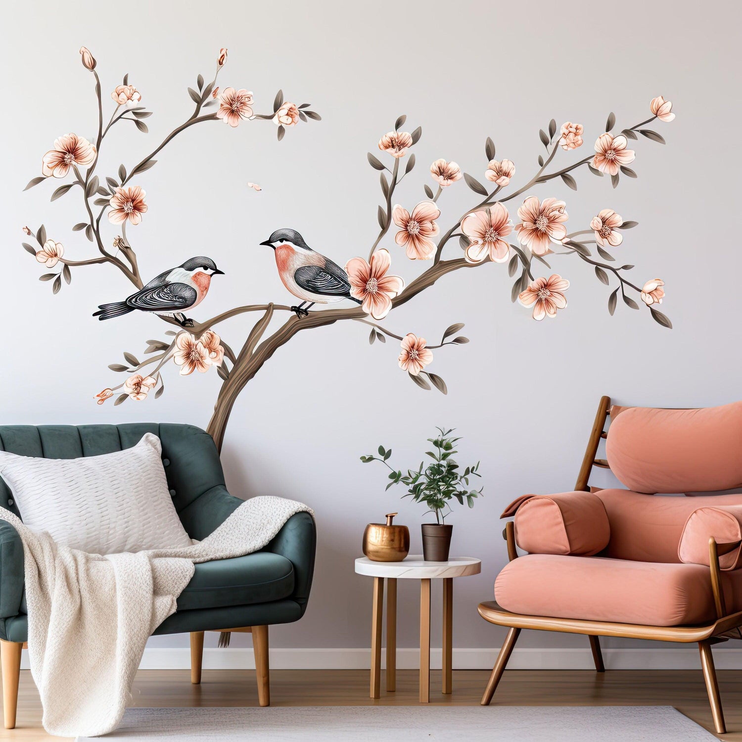 Tree wall sticker with blossom flowers and birds, elegant vinyl decor for a serene living room.