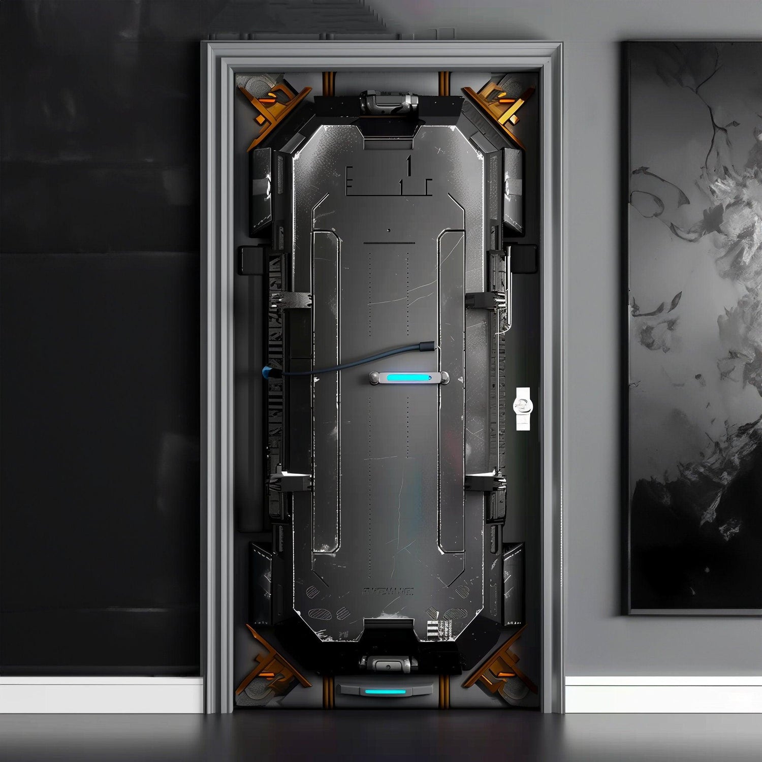 3D spaceship door cover sticker mural, decorative air lock design on interior door, sci-fi home decor accent.