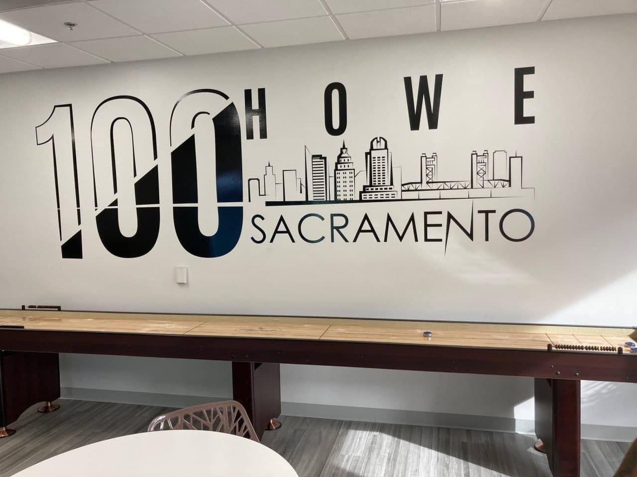 Custom wall decal logo showcasing personalized design on a textured wall with modern chair.