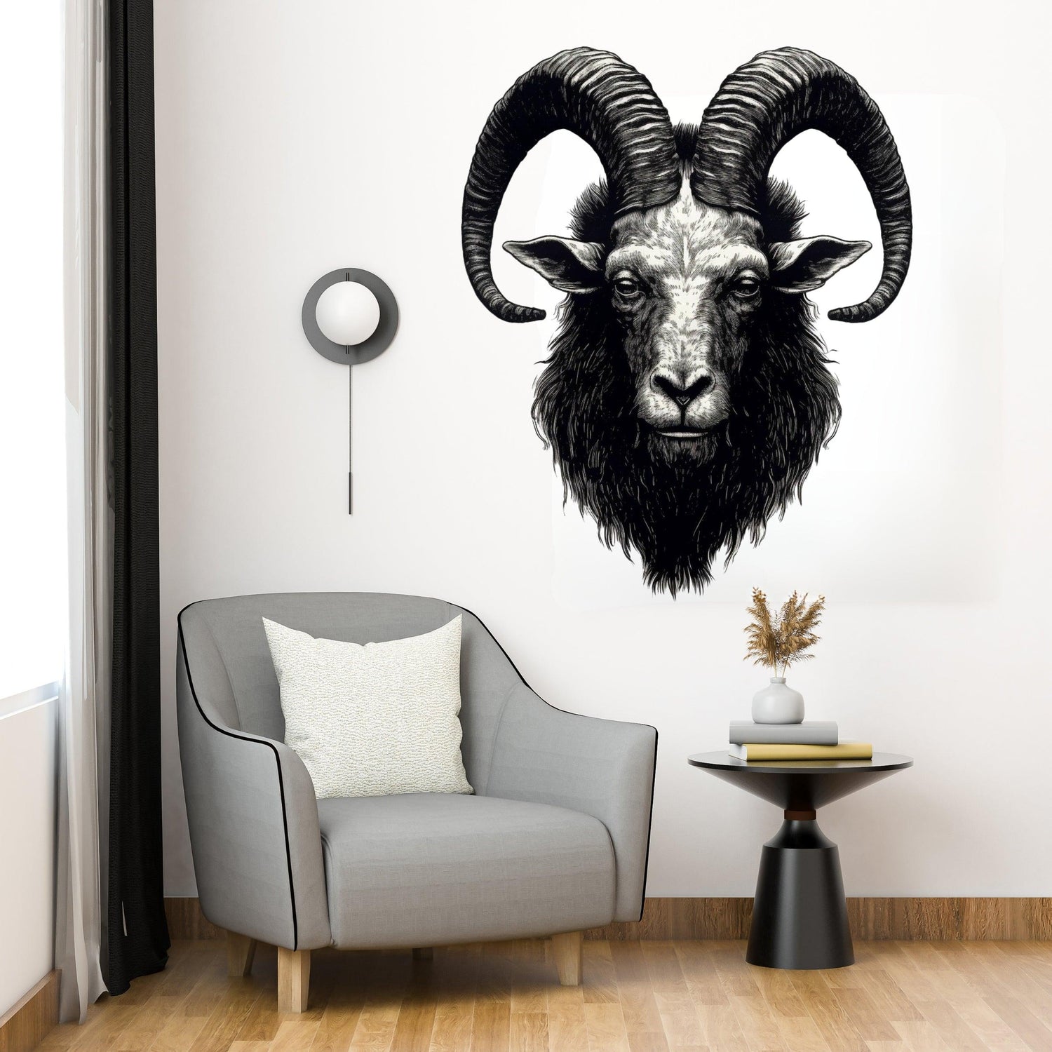 Realistic ram head wall decal with detailed ink illustration, showcasing surreal art in a modern interior.