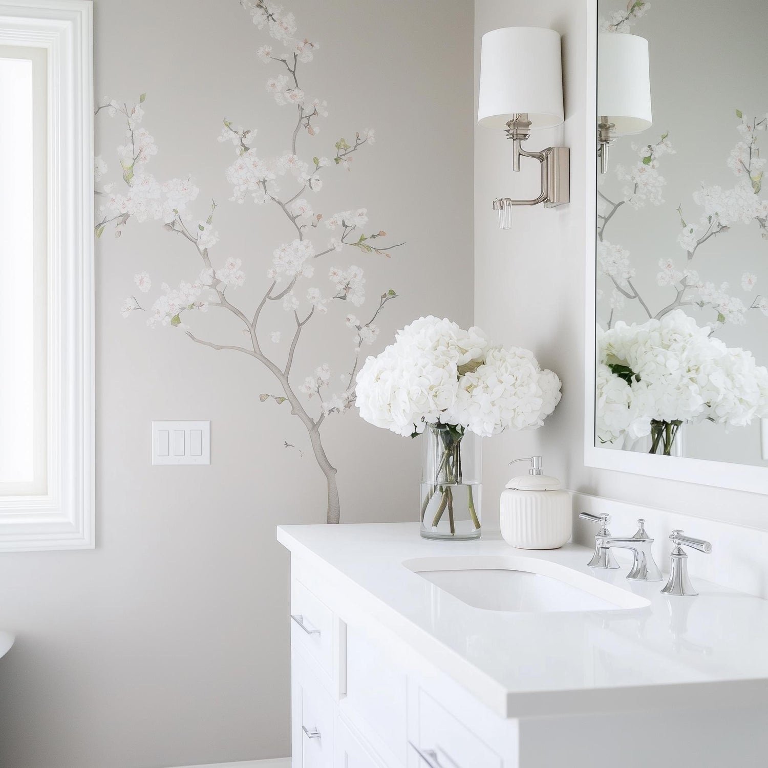 Elegant Chinoiserie blossom wall decal in light gray bathroom with a white vanity and fresh flowers.